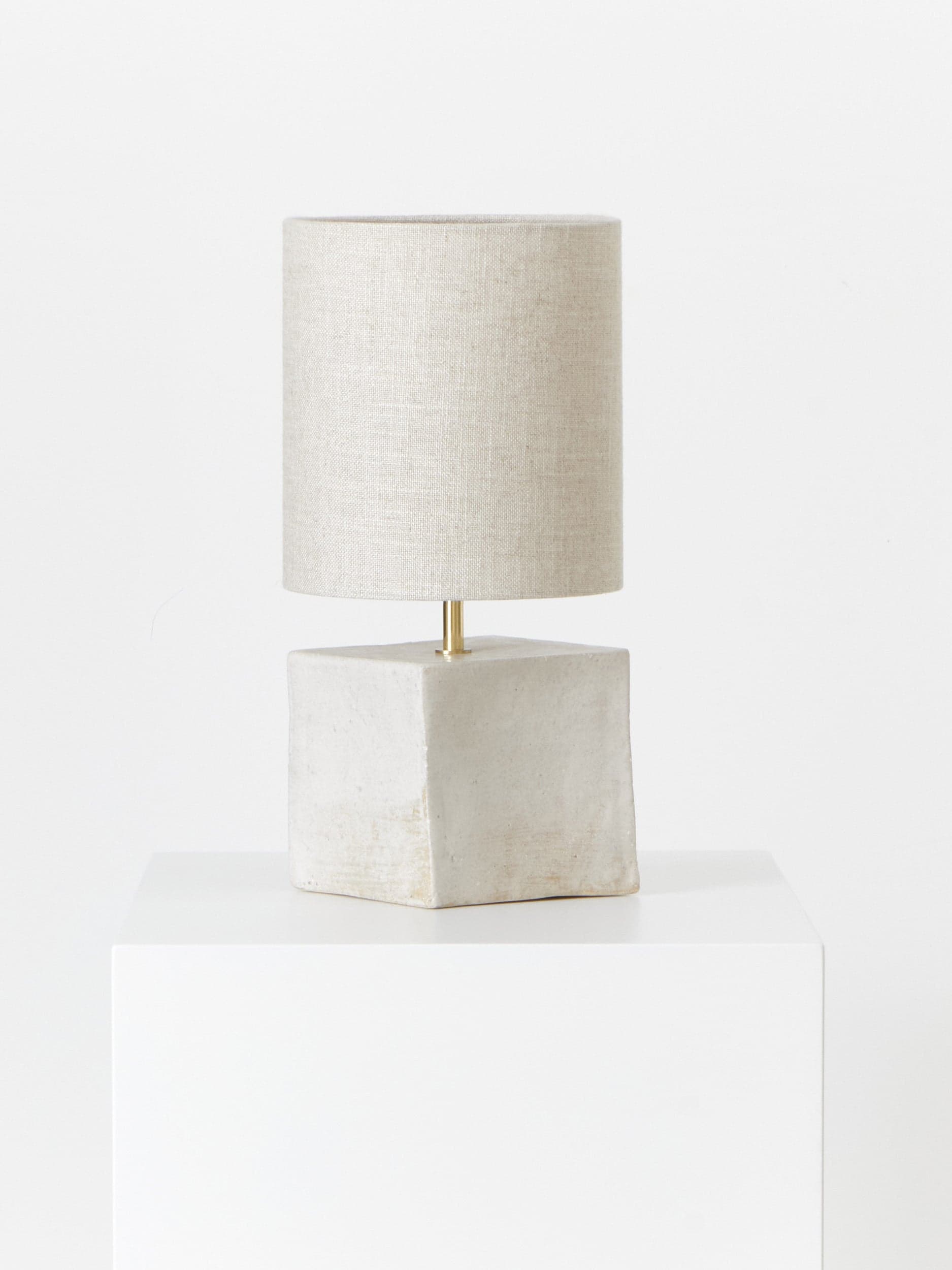 Chic white highlights the organic texture and shape of a modern accent table lamp. Its cubic base is hand-crafted by skilled ceramic artisans, and it pairs with a geometric shade to create fresh, organic energy in your living area or bedroom.