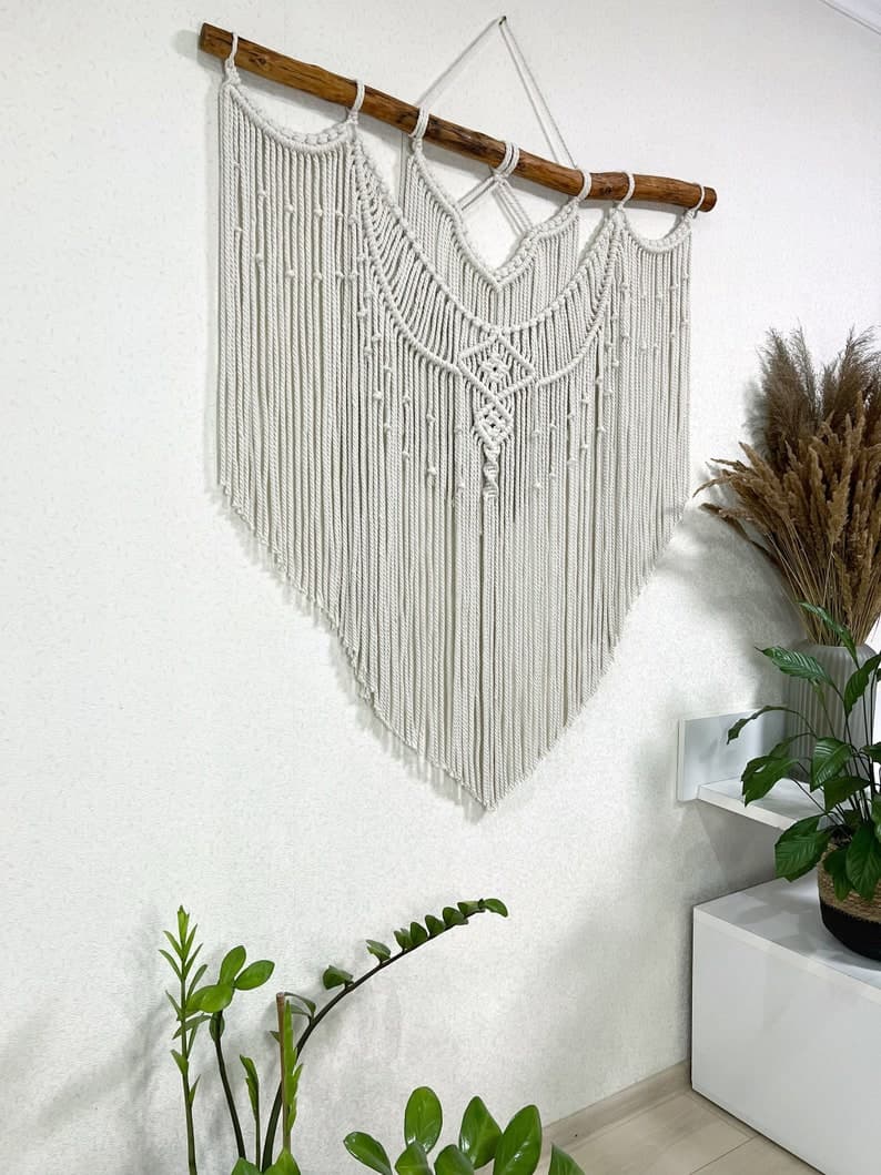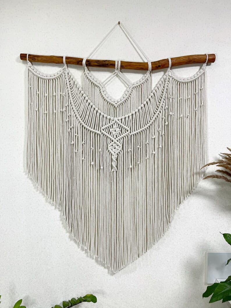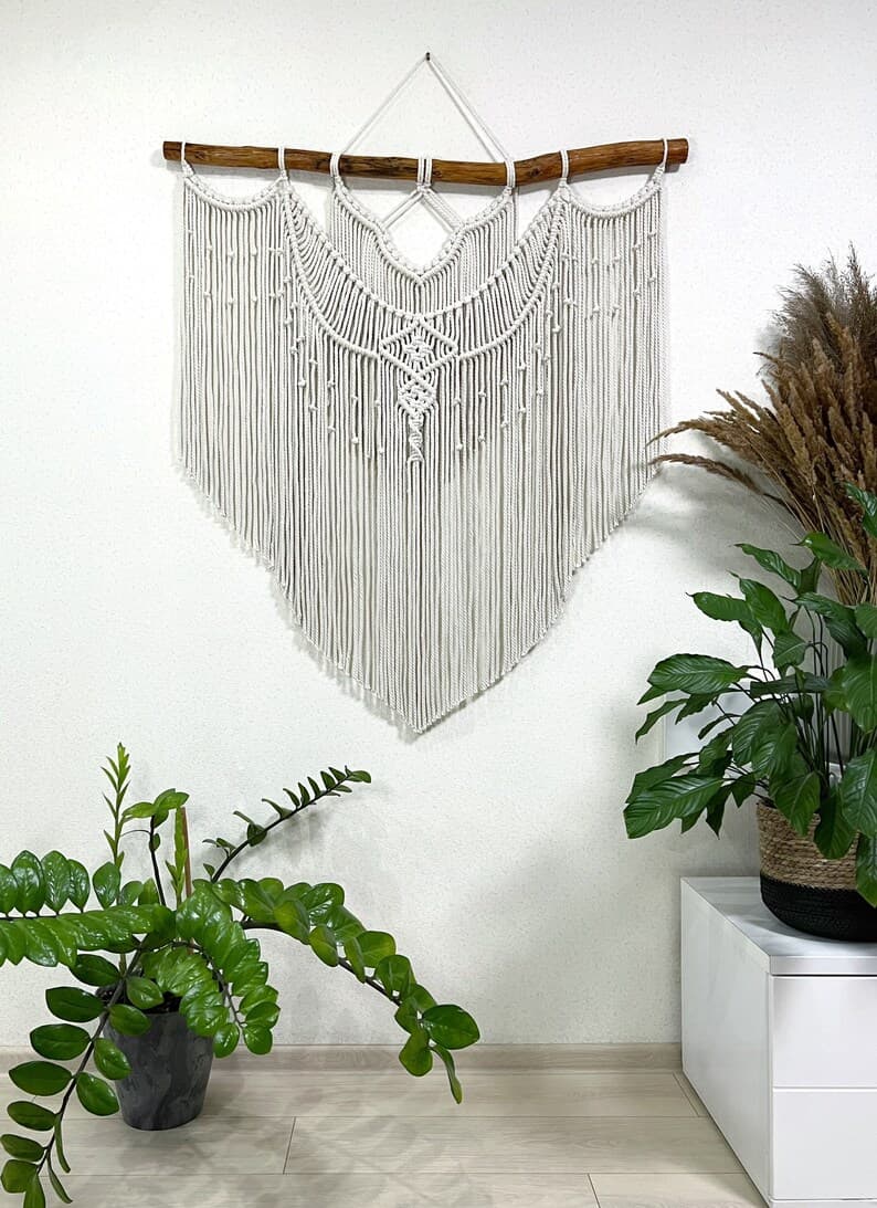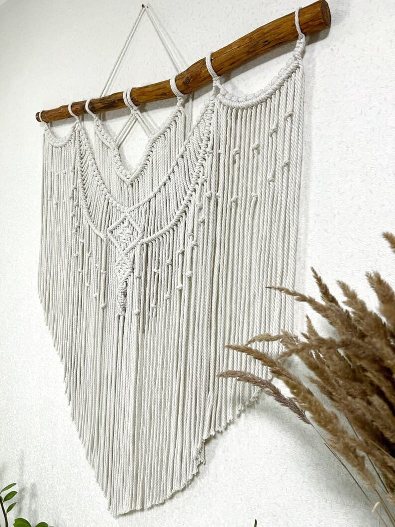 This Wall Hangings item by MagicKnitShop has 11 favorites from Etsy shoppers. Ships from Ukraine. Listed on Apr 3, 2025. Minimalist macrame wall hanging decor can be an unique addition to any room in your house, or a great gift. The wall hanging will make your bedroom, living room or nursery cozy and homely. This macrame backdrop will also be good for a wedding arch or boho wedding photo zone. The item is made of unbleached twisted cotton cord (diameter of 6 mm). Natural material. Before making this macrame I’ll send you pictures of pieces of wood for choosing. Size 41x43 inches (105x110 cm) +-. Custom orders are welcome. If you have any questions write me please. Price includes shipping. Made with love! Enjoy your shopping!