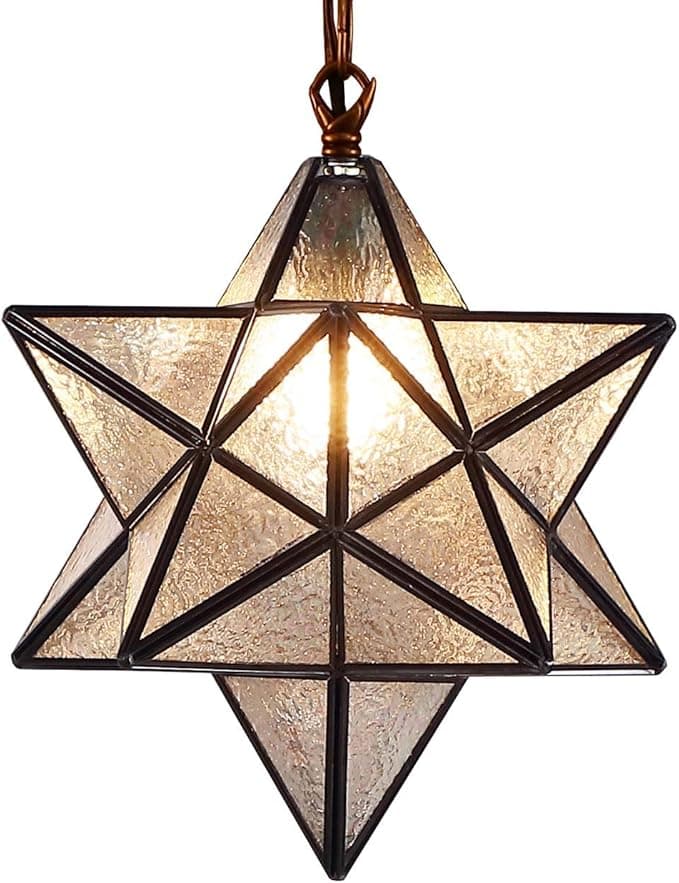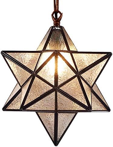 A Moravian star (German: Herrnhuter Stern) is an illuminated Advent, Christmas, or Epiphany decoration popular in Germany and in places in America and Europe where there are Moravian congregations. The star takes its English name from the Moravian Church, originating in Moravia. In Germany, they are known as Herrnhut stars, named after the Moravian Mother Community in Saxony, Germany, where they were first commercially produced. This ceiling pendant light has a Moravian star design, the lampshade is made of iridescent glass. you can install the bulb by opening a corner of the star. it looks brilliant when you light it up.