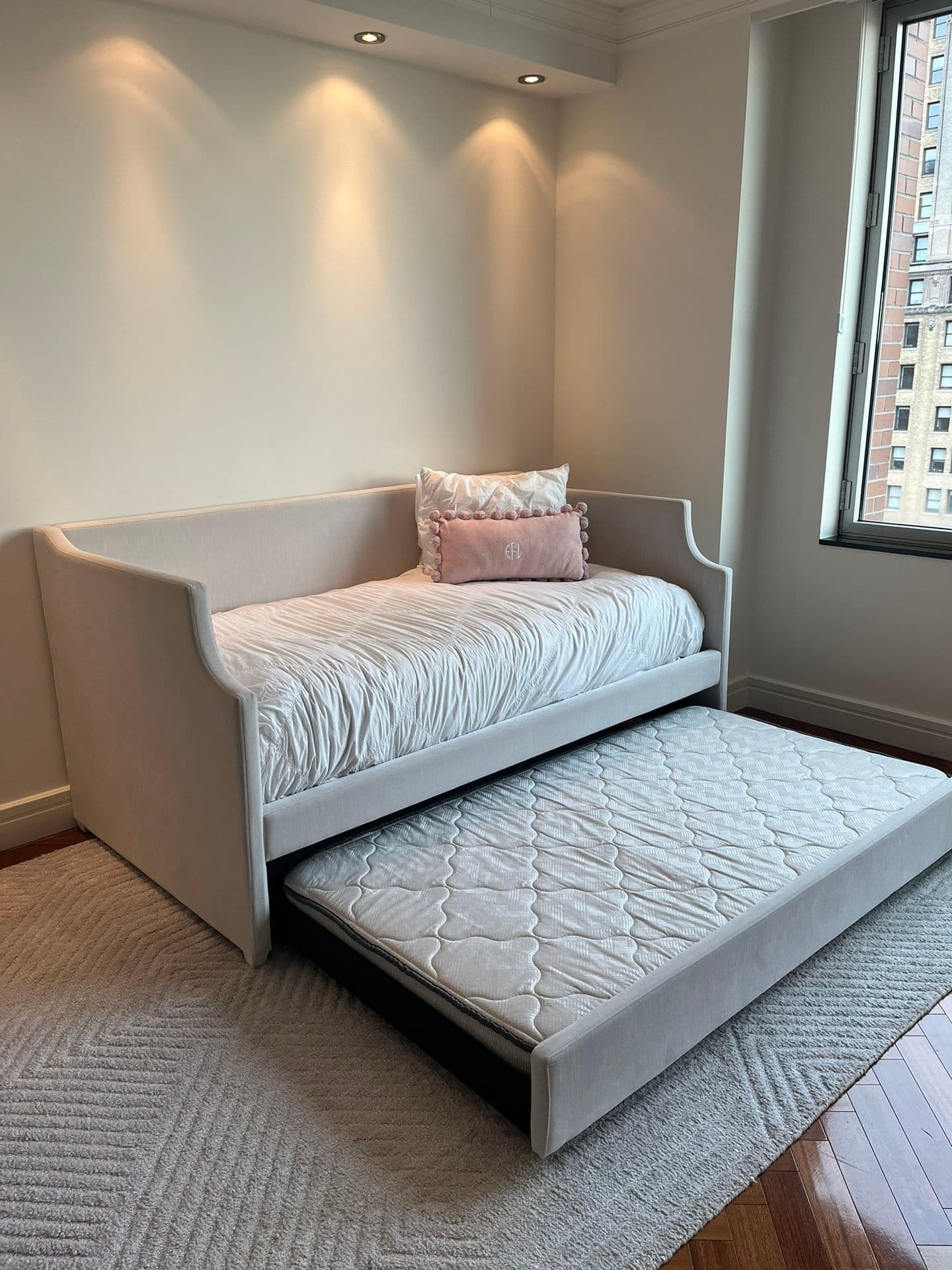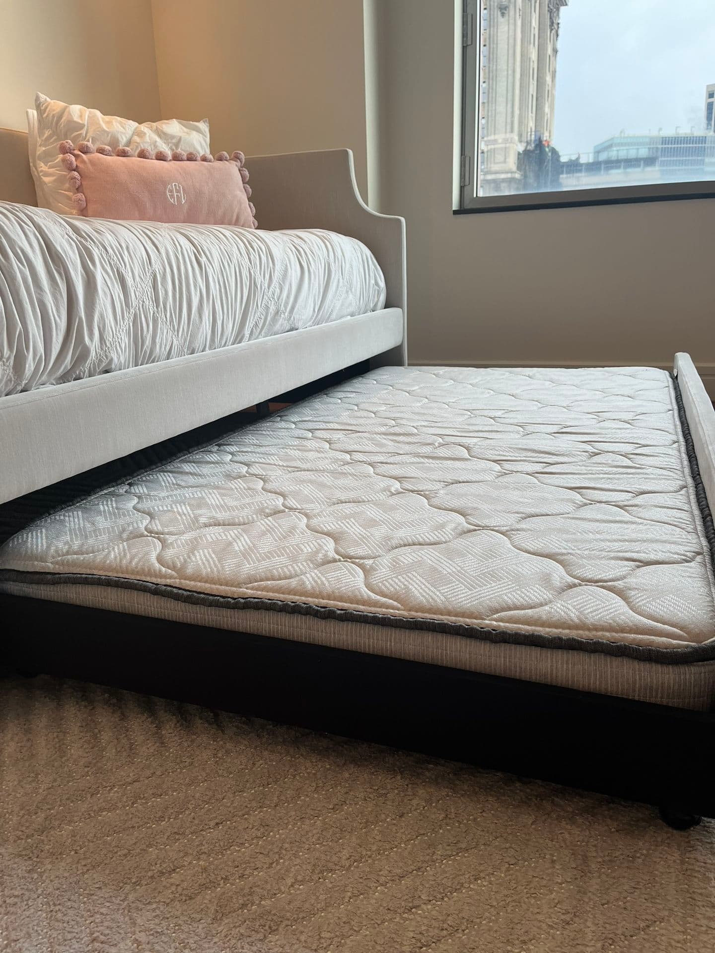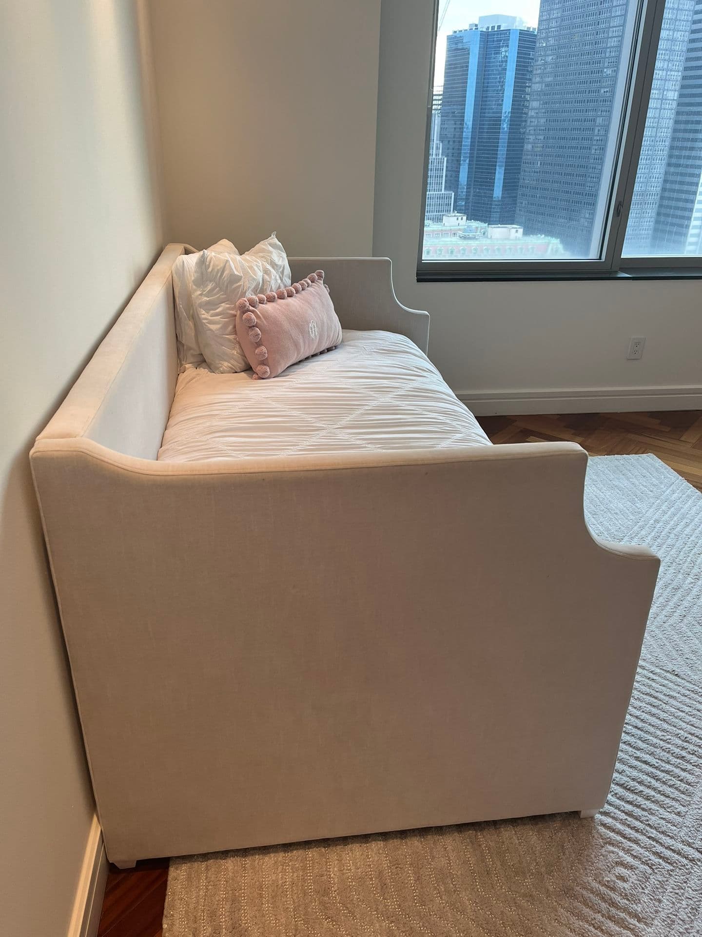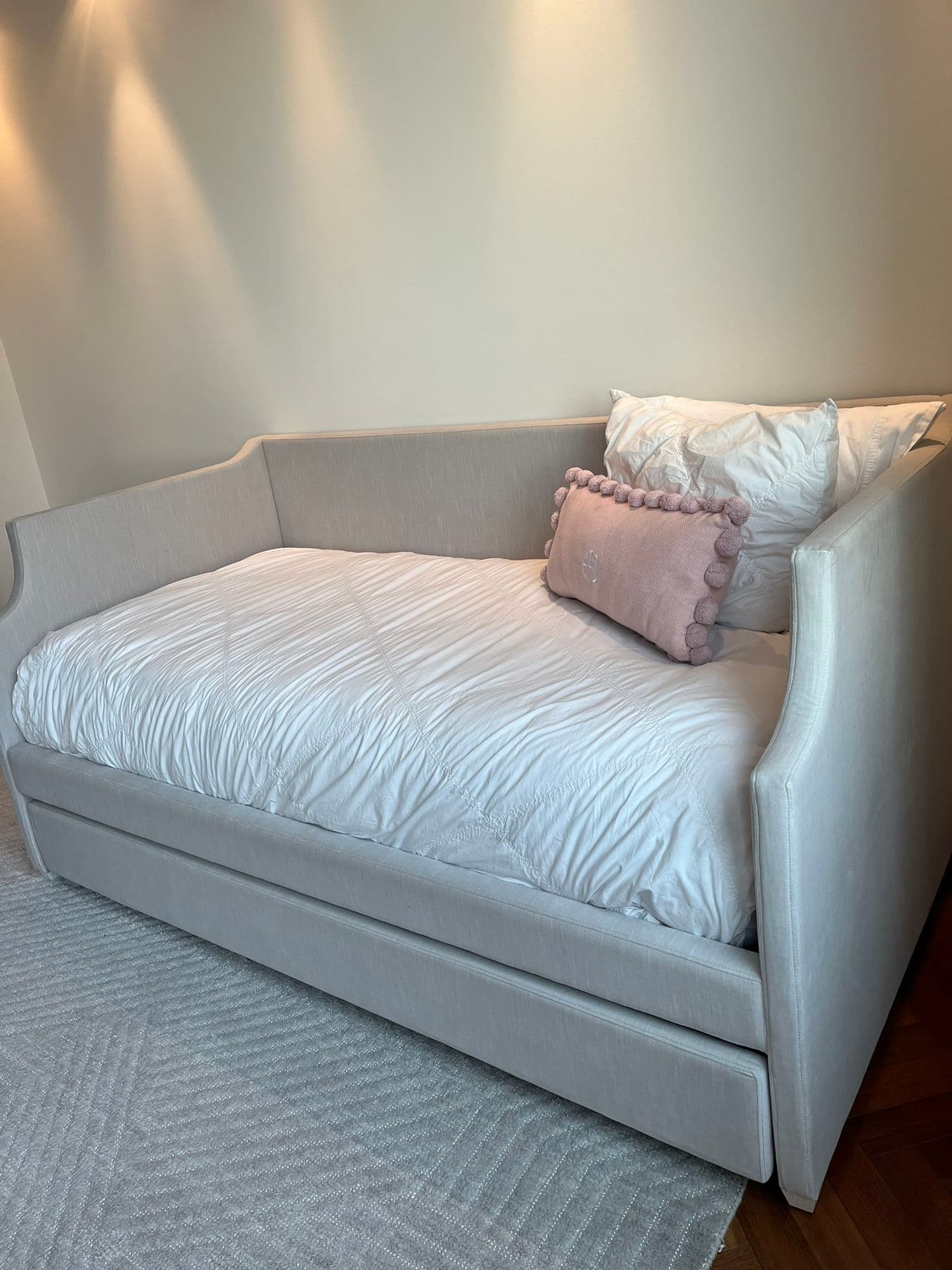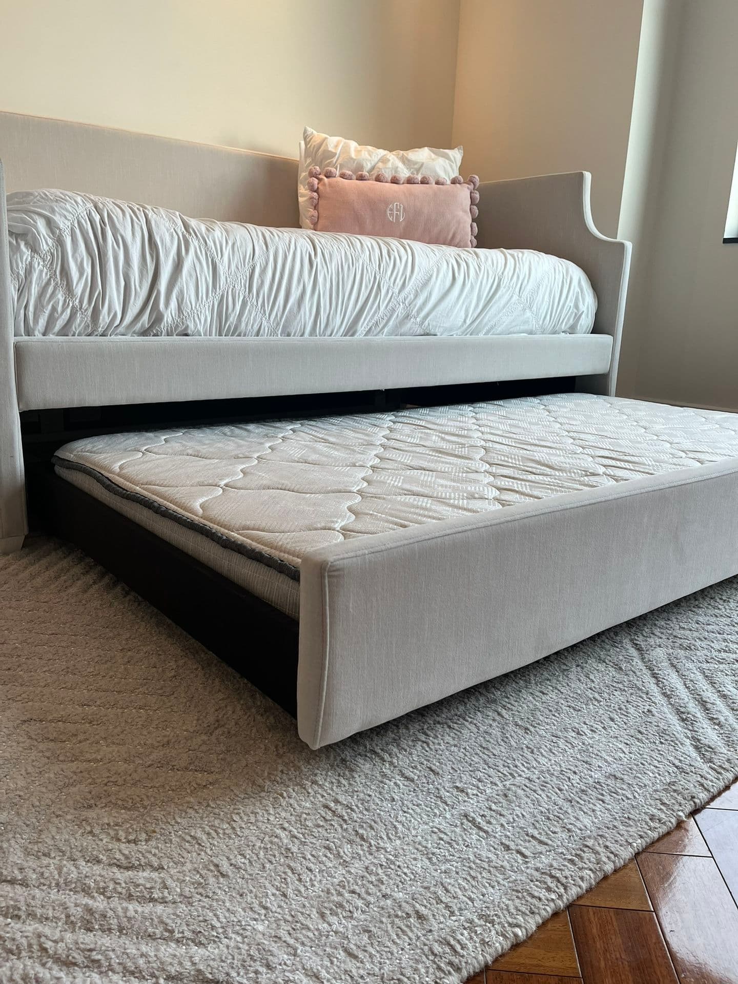 Used (normal wear), Restoration Hardware Annika upholstered daybed with trundle. In excellent condition. Purchased in August 2022. Both daybed and trundle mattresses included. One Simmons trundle twin mattress, and one Beautyrest luxury plush euro twin mattress. Also includes two pottery barn teen ruched, diamond organic duvet covers (in excellent condition) and also three sets of twin sleep number essential fit cotton sheets. No delivery available. Must be able to pick up!