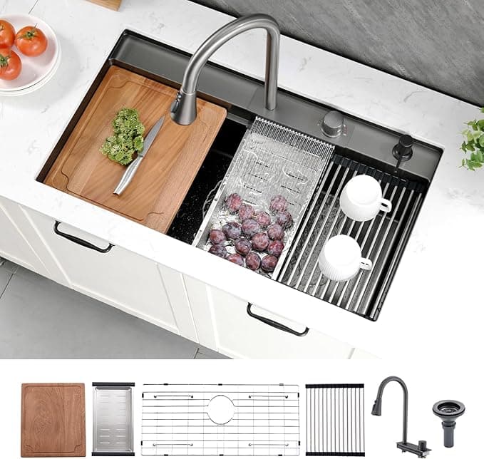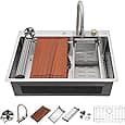 33 Inch Black Undermount Kitchen Sink Waterfall Workstation, BoomHoze 33x19 Dual Mount Black Stainless Steel Multifunctional Kitchen Sink with Waterfall Faucet