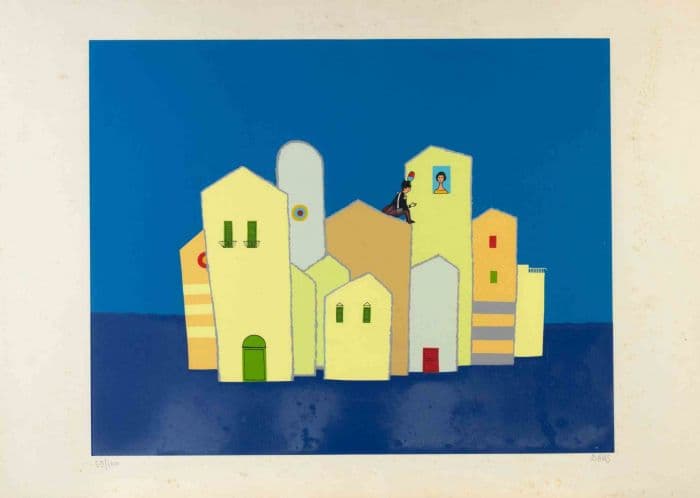 Lovers is a contemporary artwork realized by the artist Dipas in the 1970s. Mixed colored screen print. Hand signed on the lower right margin. Numbered on the lower left margin. Edition of 59/100. Foxing on paper.