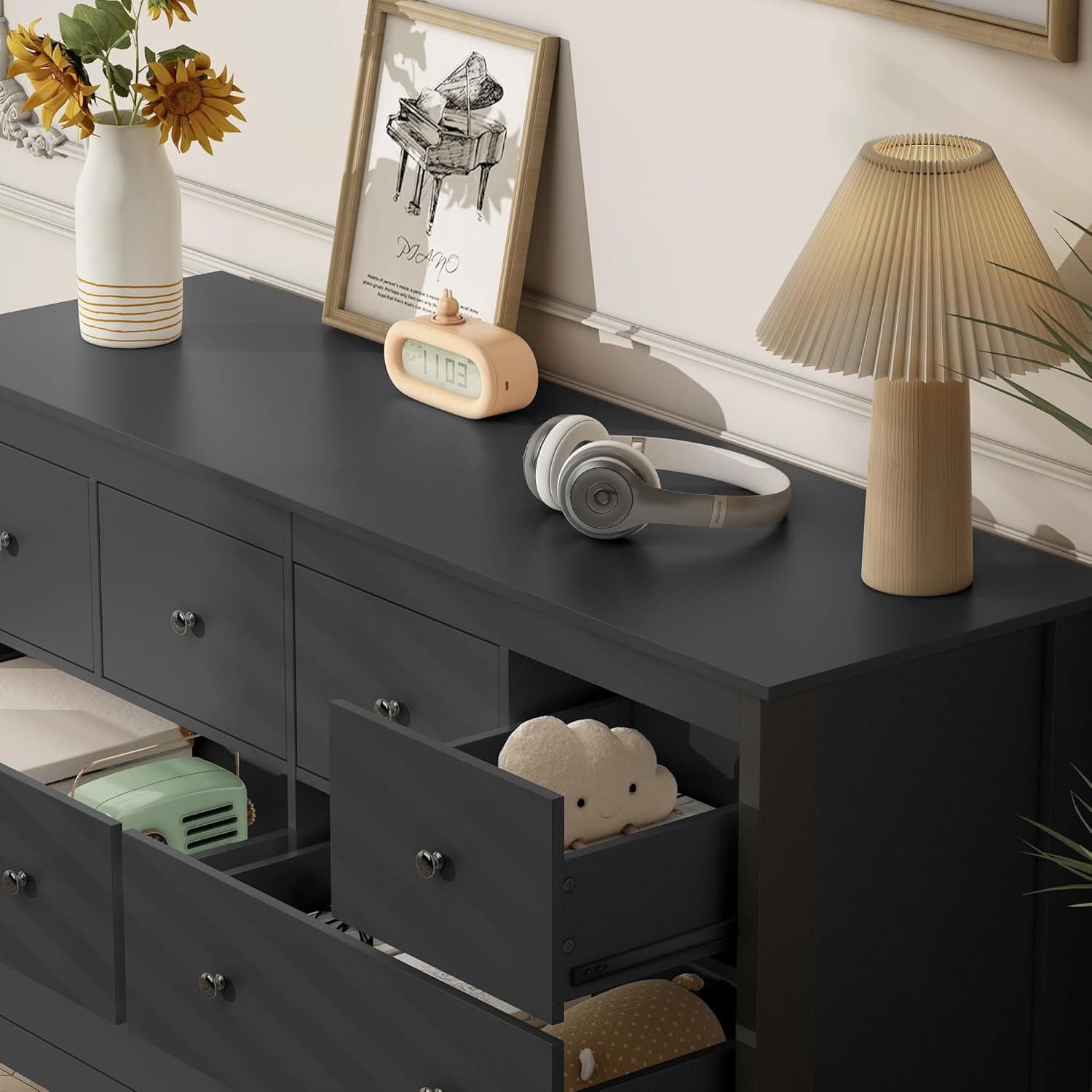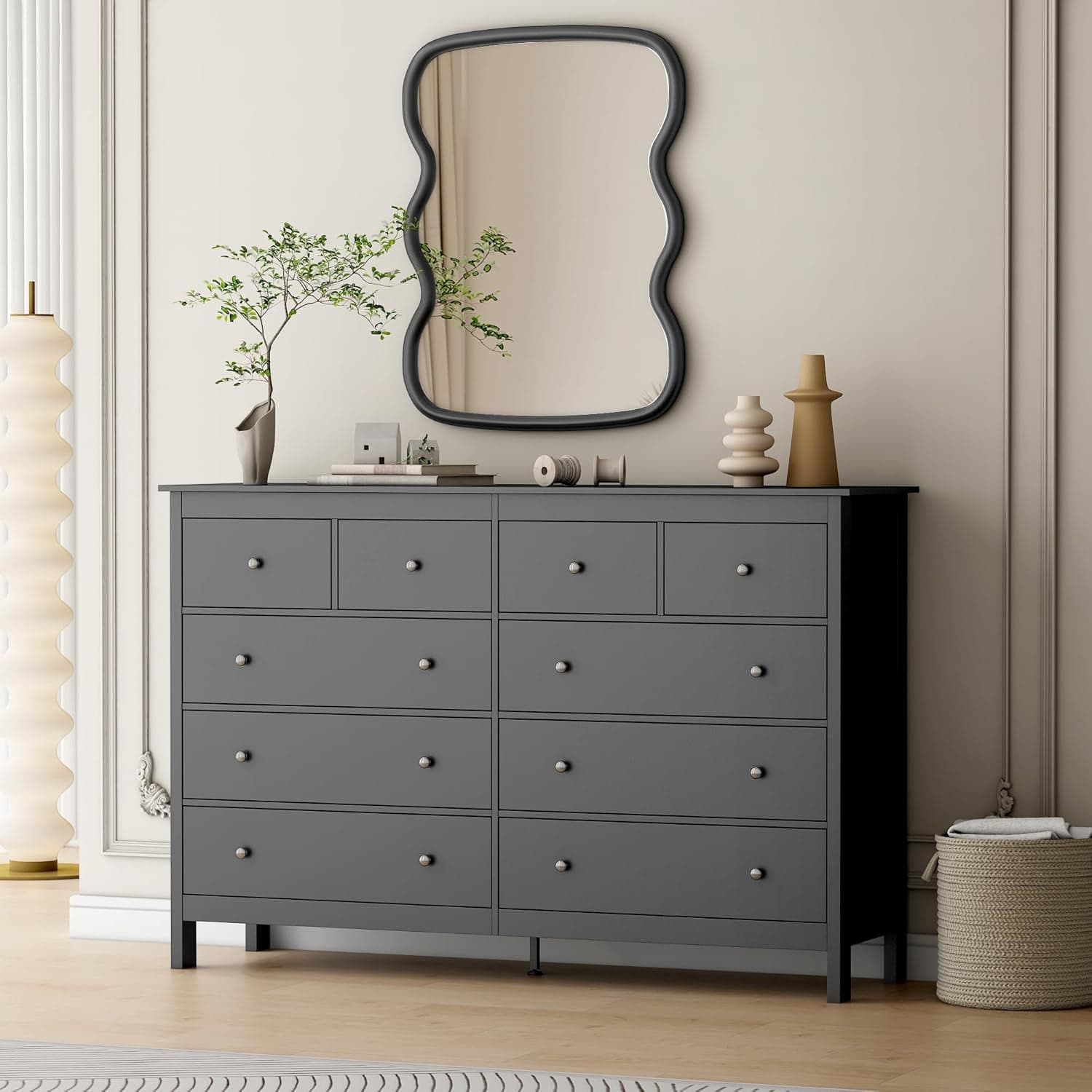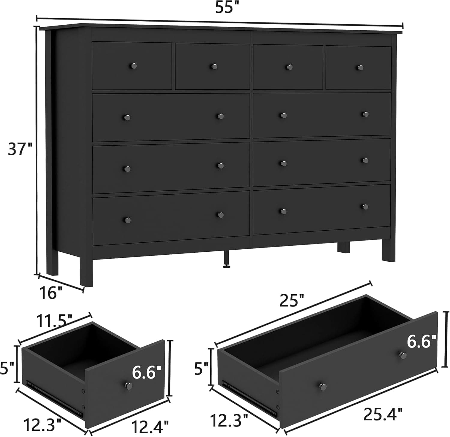 The ICEELF white 10-drawer dresser boasts a modern style that complements any contemporary home. Whether placed in the living room or bedroom, it adds a stylish and noble aesthetic to your space. The dresser features ten spacious drawers, offering ample storage to meet all your needs and keep your home tidy. With dimensions of 55"W x 16"D x 37"H, the dresser includes six large drawers and four small drawers, perfect for organizing clothes, pillows, sheets, toys, documents, and more.