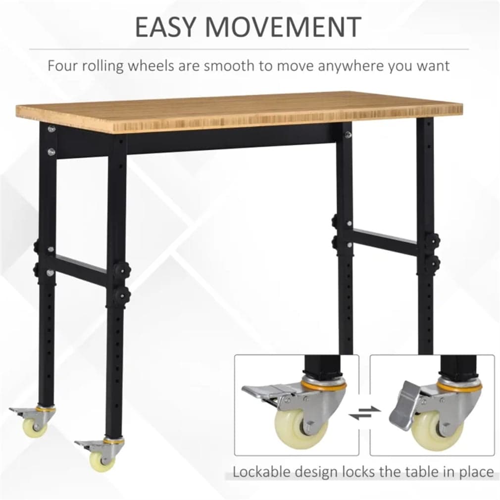 47"Garage Work Bench with Height Adjustable Legs and Wheels, Heavy-Duty Workstation with Bamboo Wood Top and Metal Frame for Workshop, Office and Home, Natural+Black