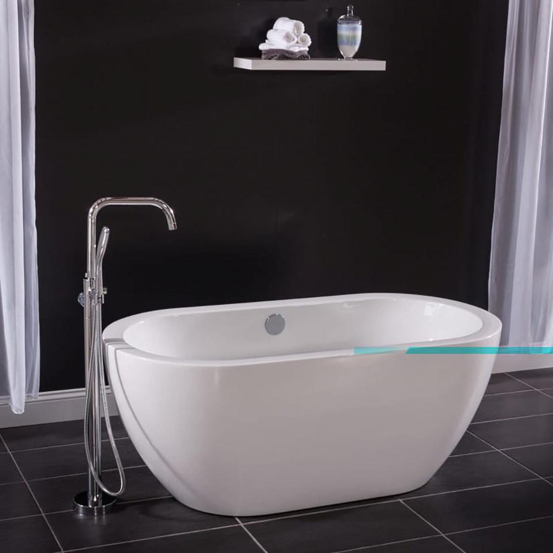 60" x 30" Oval Freestanding Acrylic Bathtub - Includes Drain Assembly. Constructed of Lucite acrylic, providing a warm, smooth touch, long-lasting color, and is extremely easy to maintain. Polished Chrome toe tap and overflow drain assembly included free. Self-leveling legs make installation simple on virtually any surface. 100% Factory performance tested with water. Features a centered toe tap drain.