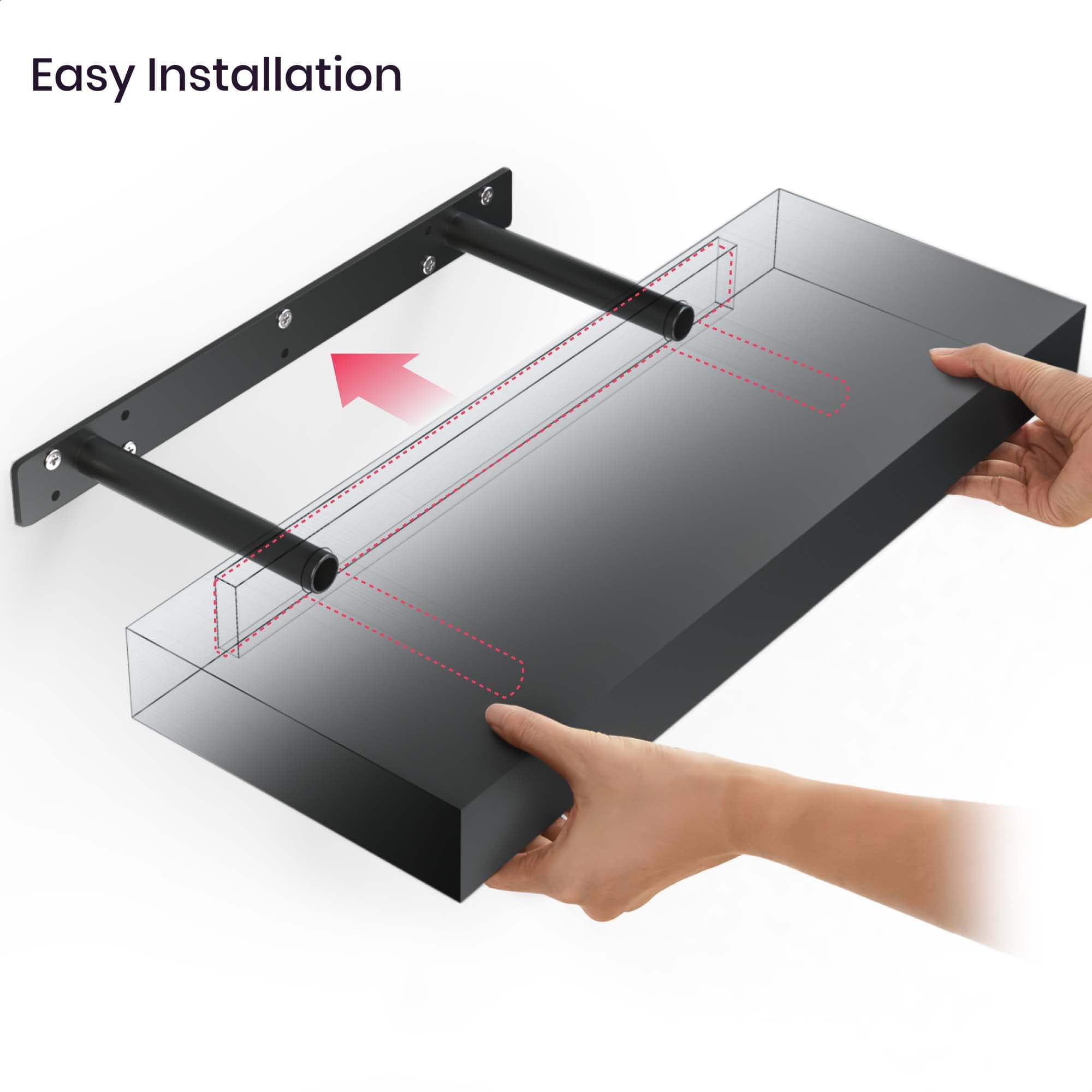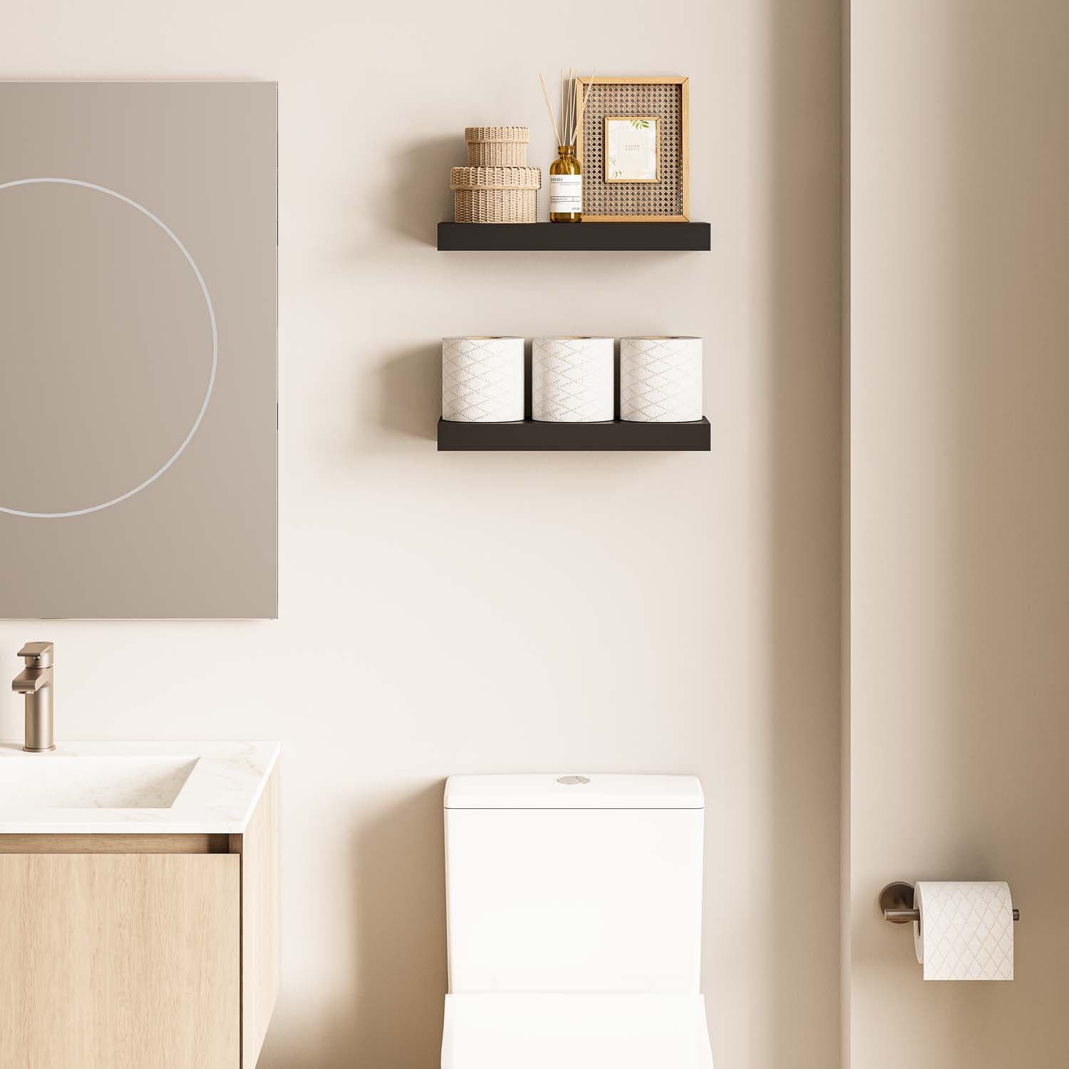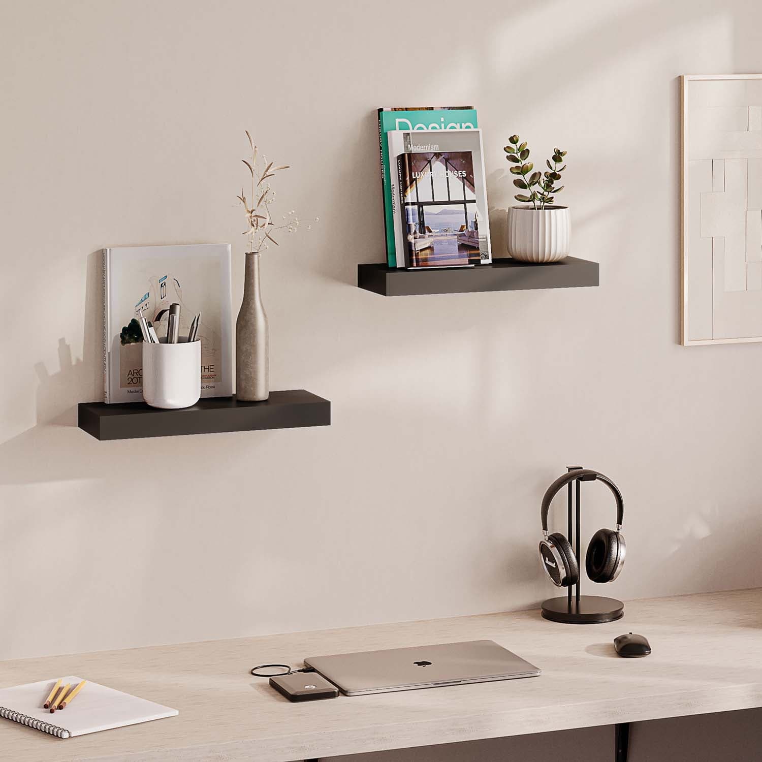 These Ballucci 16" Floating Shelves for Wall, 2-Pack with Invisible Brackets, Black set includes 2 shelves, each 16" long and 6" deep, to allow you create an attractive gallery style wall display in your home. These sleek and stylish floating wall shelves not only elevate your décor but will let you make full use of wall storage space and display your favorite items in a creative and attractive way. Showcase your favorite album records, wall art, books, magazines, or picture frames. Use these wide wall mounted shelves as floating book shelves, small toy organizer, photo ledge shelves, towel racks in bathroom, or kitchen spice rack to organize your bottles and jars. These shelves are great for your bathroom, bedroom, kitchen, living room, dining room, playroom, kids room, nursery, store, garage, storage room and more. All shelves are fully assembled. Easy-to-understand instructions and hanging hardware with hidden mounting metal brackets are included to make sure the shelf can be mounted on wall with ease.