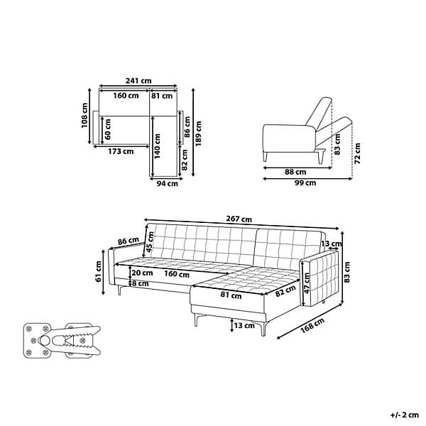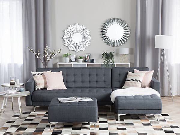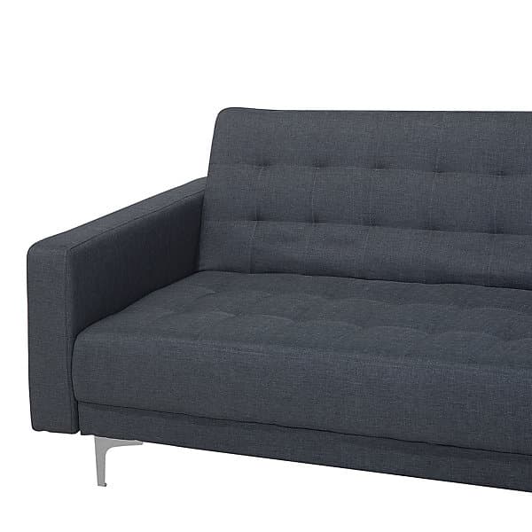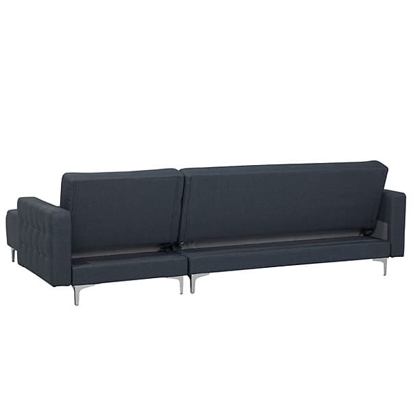 This large corner sofa is an ideal anchor piece for your living room, inviting and homely. Versatile in design, the sofa can be turned into a comfortable bed for two thanks to the adjustable backrest. Additionally, the chaise can be positioned on either side to suit your needs. Fully upholstered in high-quality, dark grey fabric with elegant tufting, this corner sofa offers both functionality and timeless style that will highlight the best of any modern home. The whole piece is kept stable thanks to metal legs.