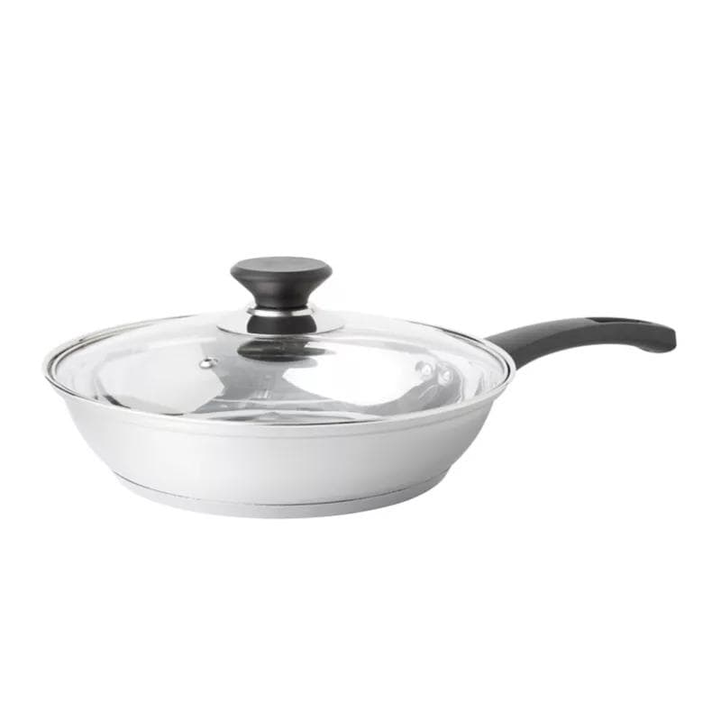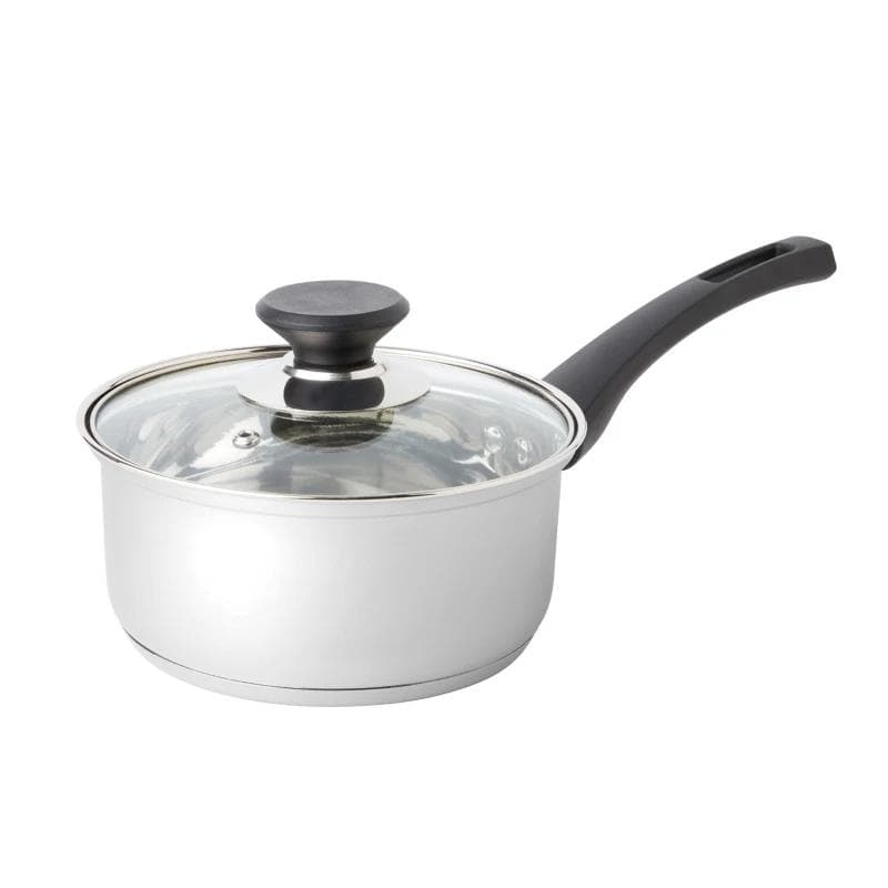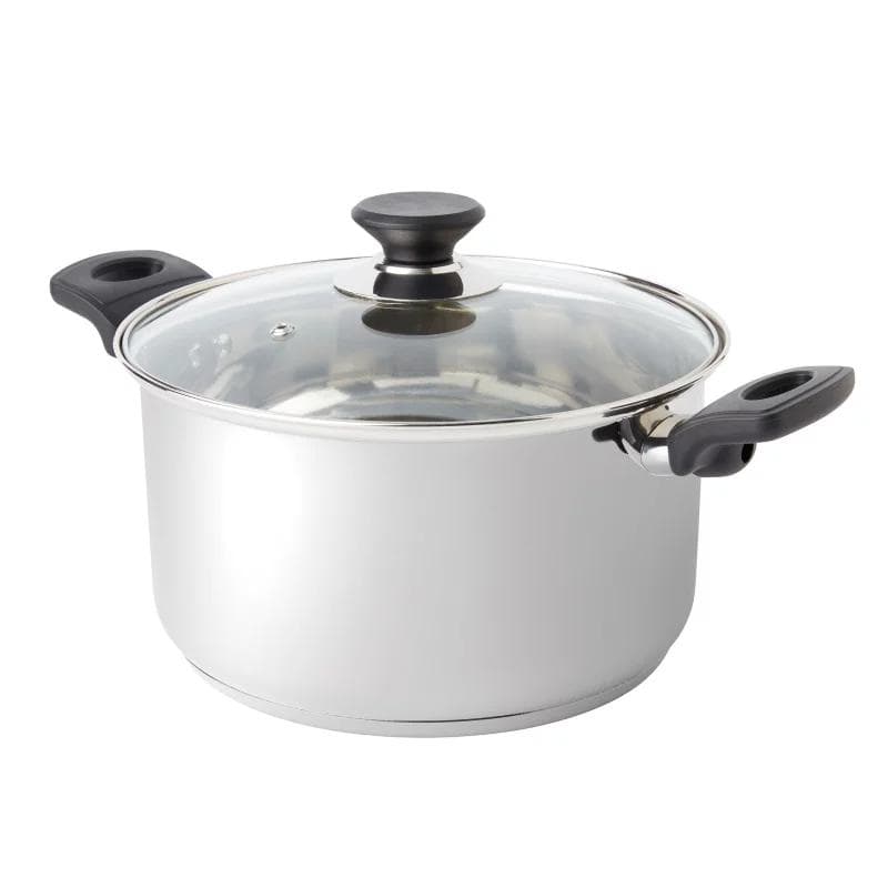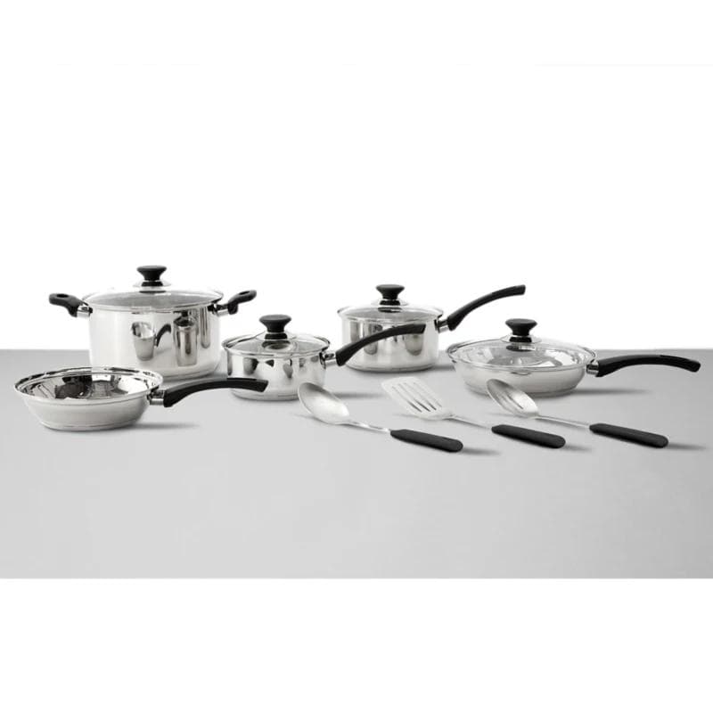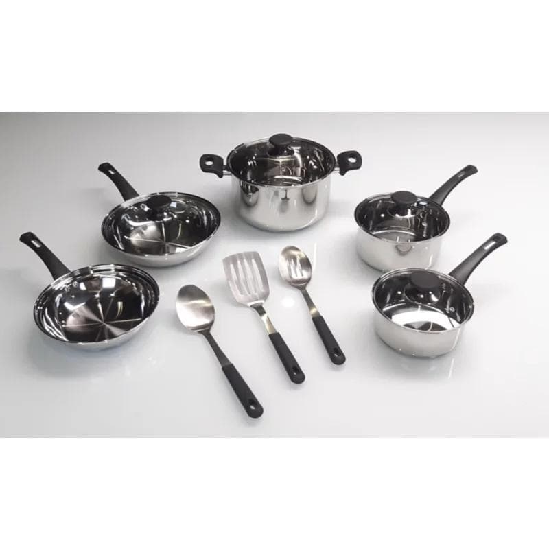 Set is comprised of everyday cooking vessels and utensils with durable stainless steel construction for lasting use. Includes: 8" fry pan, 10" fry pan with lid, 1.5 qt. saucepan with lid, 2.5 qt. saucepan with lid, 5 qt. Dutch oven with lid, Solid spoon, Slotted spoon, Slotted turner. Suitable for use on all stove types, including induction. Covered cookware comes with a glass lid that allows food to be monitored during the cooking process. Bakelite handles and knobs stay cool to the touch on your stovetop.