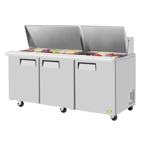 The XST-72-30-N model from Refrigeration X (a Turbo Air company) is a sandwich/salad mega top unit that features three sections and measures 72-3/4"W x 34"D x 39-5/8"H. With a capacity of 23 cu. ft., it has (3) solid doors and (3) adjustable PE coated wire shelves. It can hold up to 30 1/6 size x 4" deep pans and has (2) hoods and a cold air compartment. The unit also includes a 9-1/2" deep cutting board with side rail, stainless steel exterior door, and aluminum exterior side (galvanized steel back & bottom). It is equipped with a rear-mount self-contained compressor, uses R290 Hydrocarbon refrigerant, and has a 3/8 HP compressor. The unit operates on 115v/60/1-ph with 5.5 amps and is compatible with NEMA 5-15P.