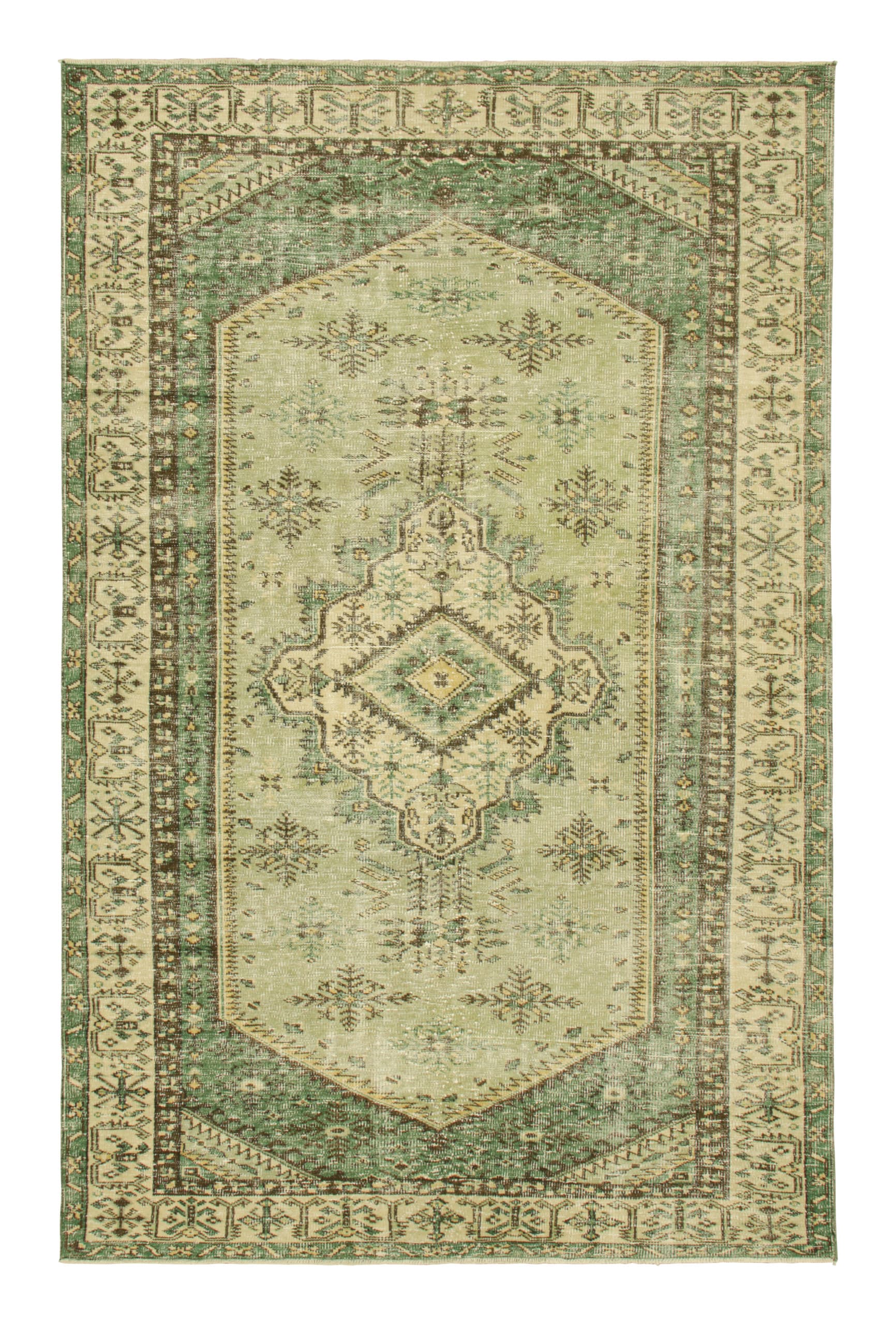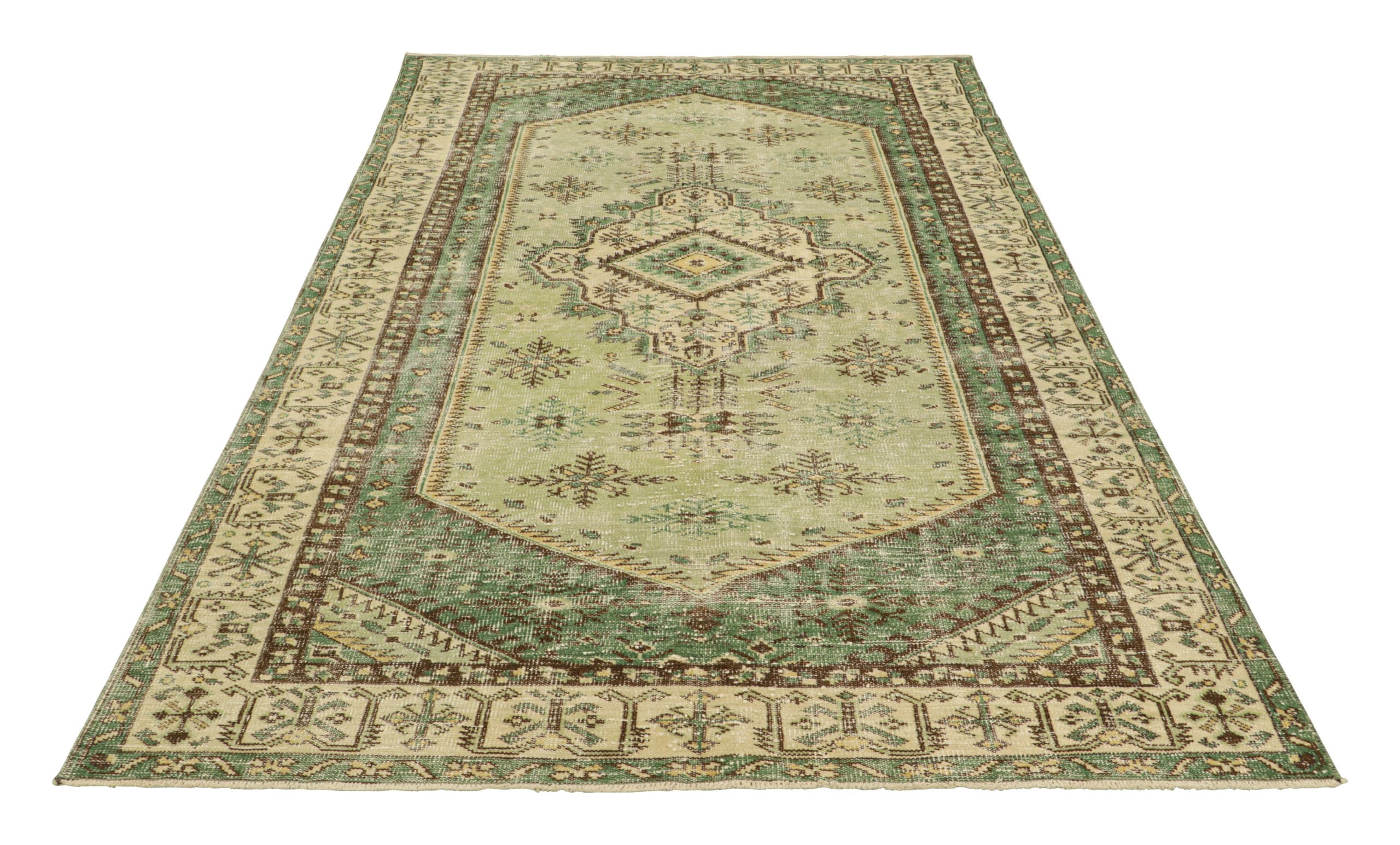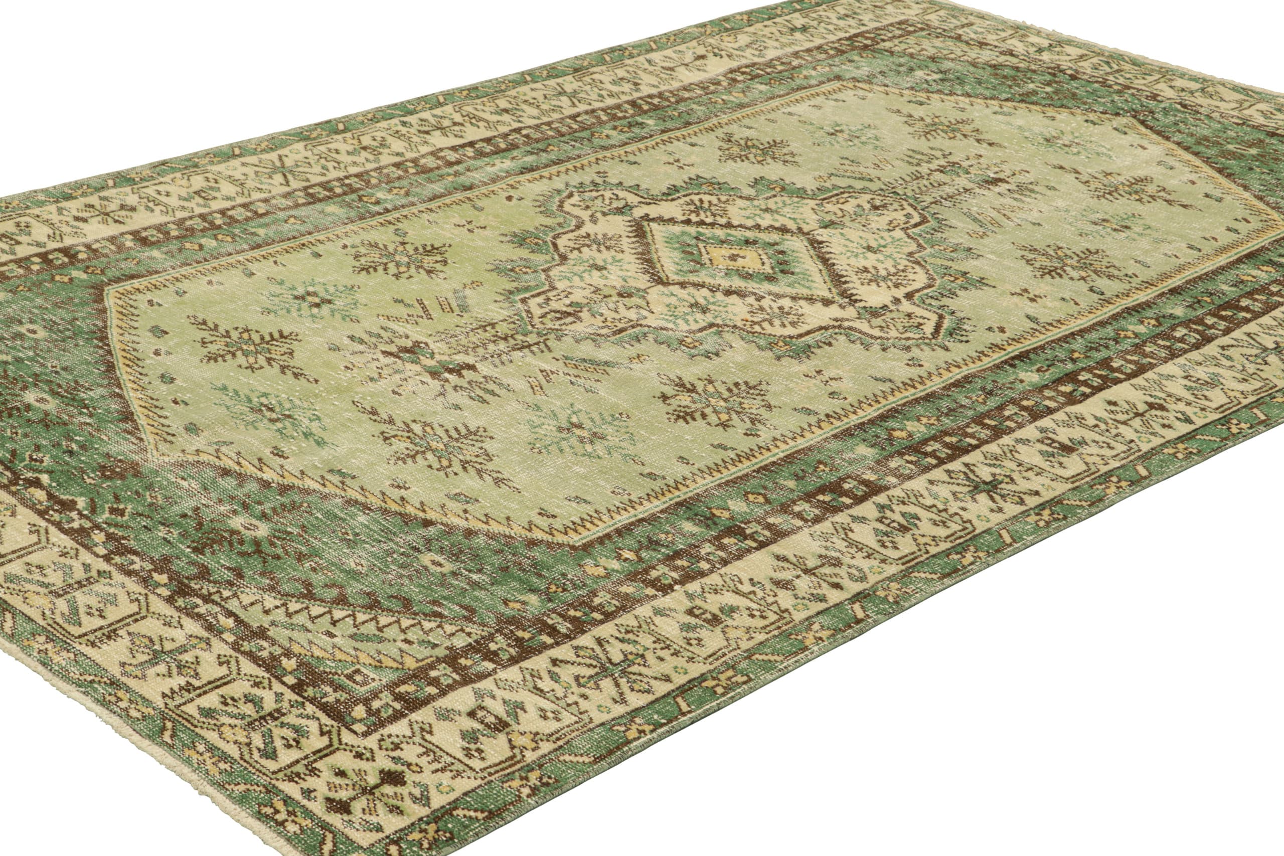Hand-knotted in wool, this 6x10 vintage Turkish rug in green, circa 1960-1970, is a unique addition to the Vintage Collection from Rug & Kilim—a curation of rare vintage rugs believed to hail from Turkish artist Zeki Müren.