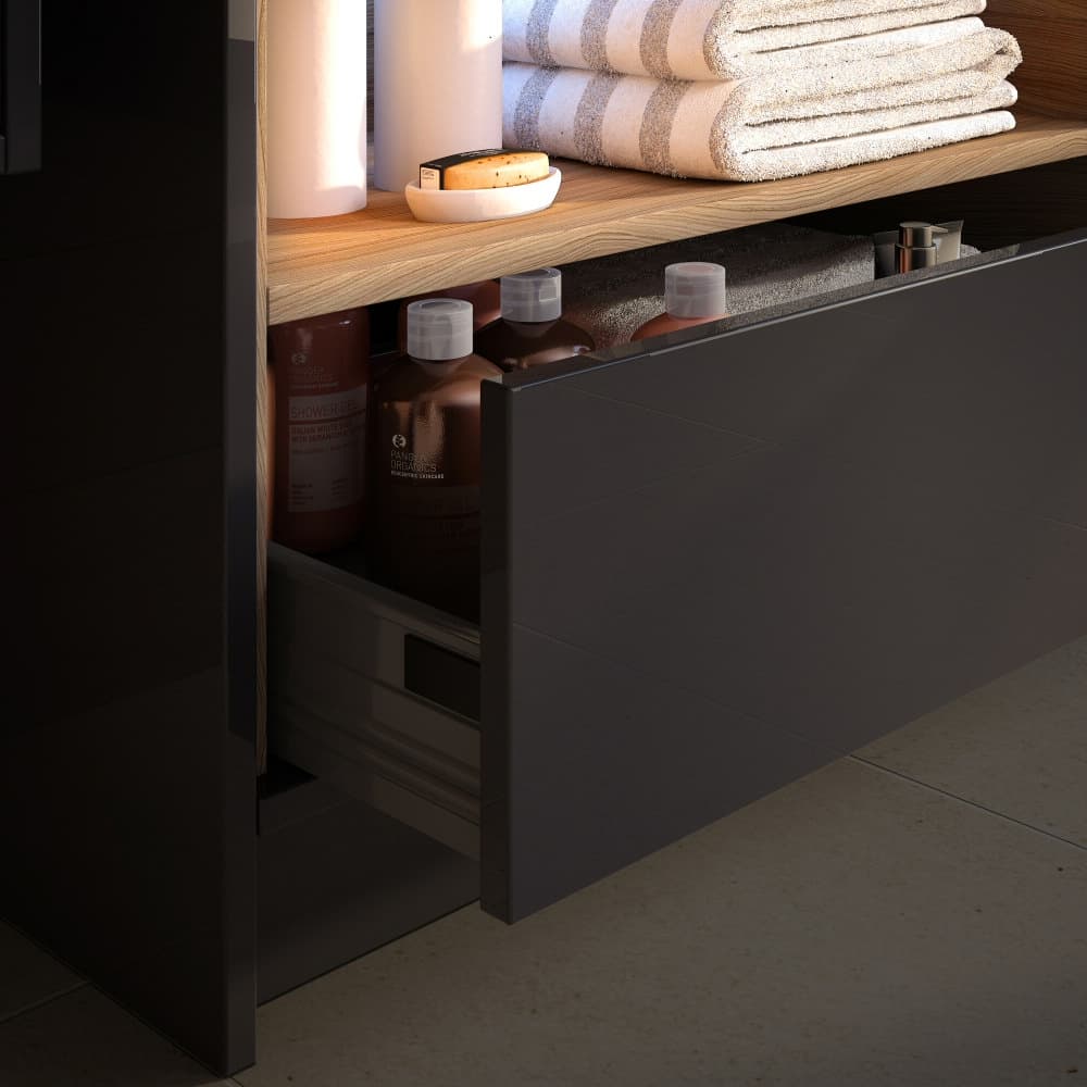 Combine the minimalist look and latest technology of push open doors and drawers with open shelves in the Coast collection. The open shelves complement the fascia choice and provide immediate access to your bathroom necessities. Coast is ideal for most sizes of bathroom and its unique design makes it the perfect choice for a style statement. This stunning floorstanding 2 drawer unit will create a focal point in the bathroom as the driftwood open shelf with hints of grey is a great complement to the gloss fascia. Includes a single tap hole minimalist basin.