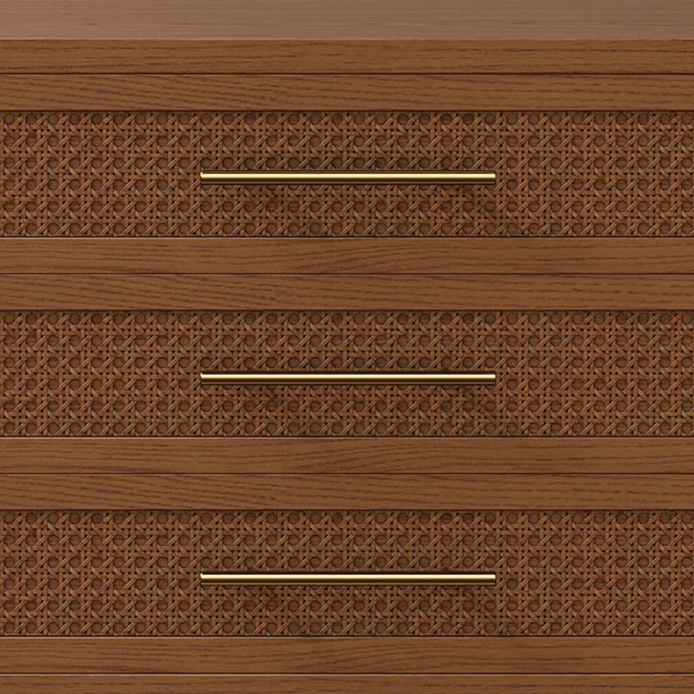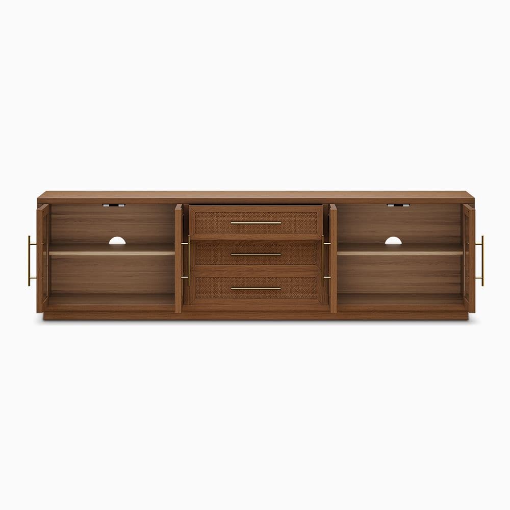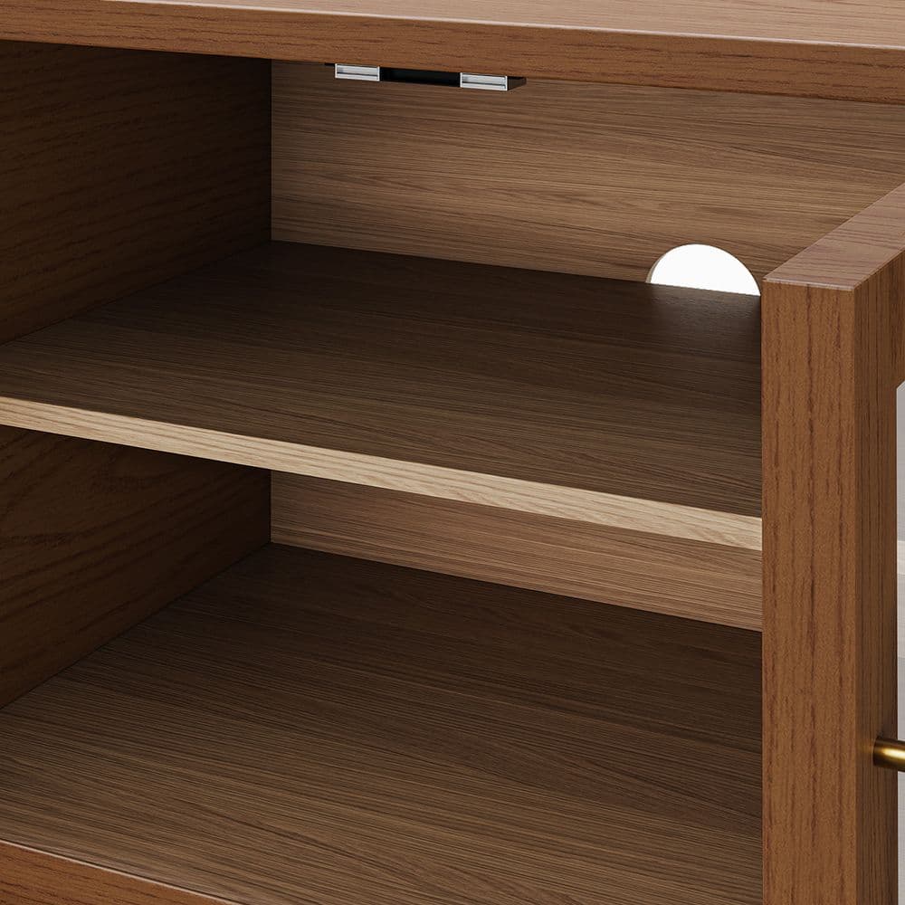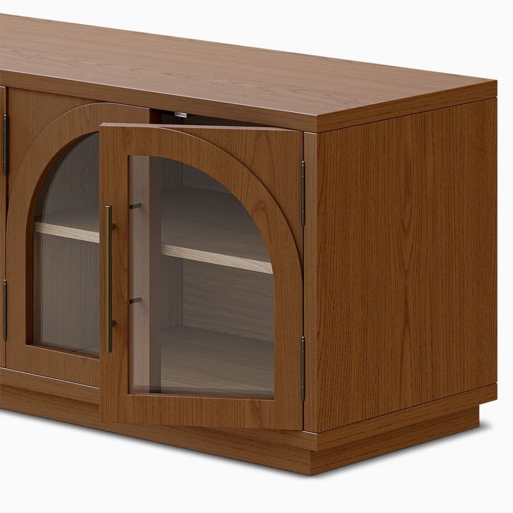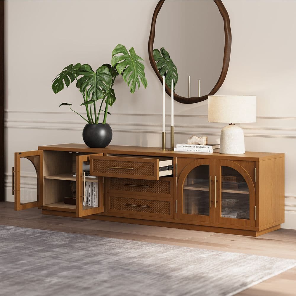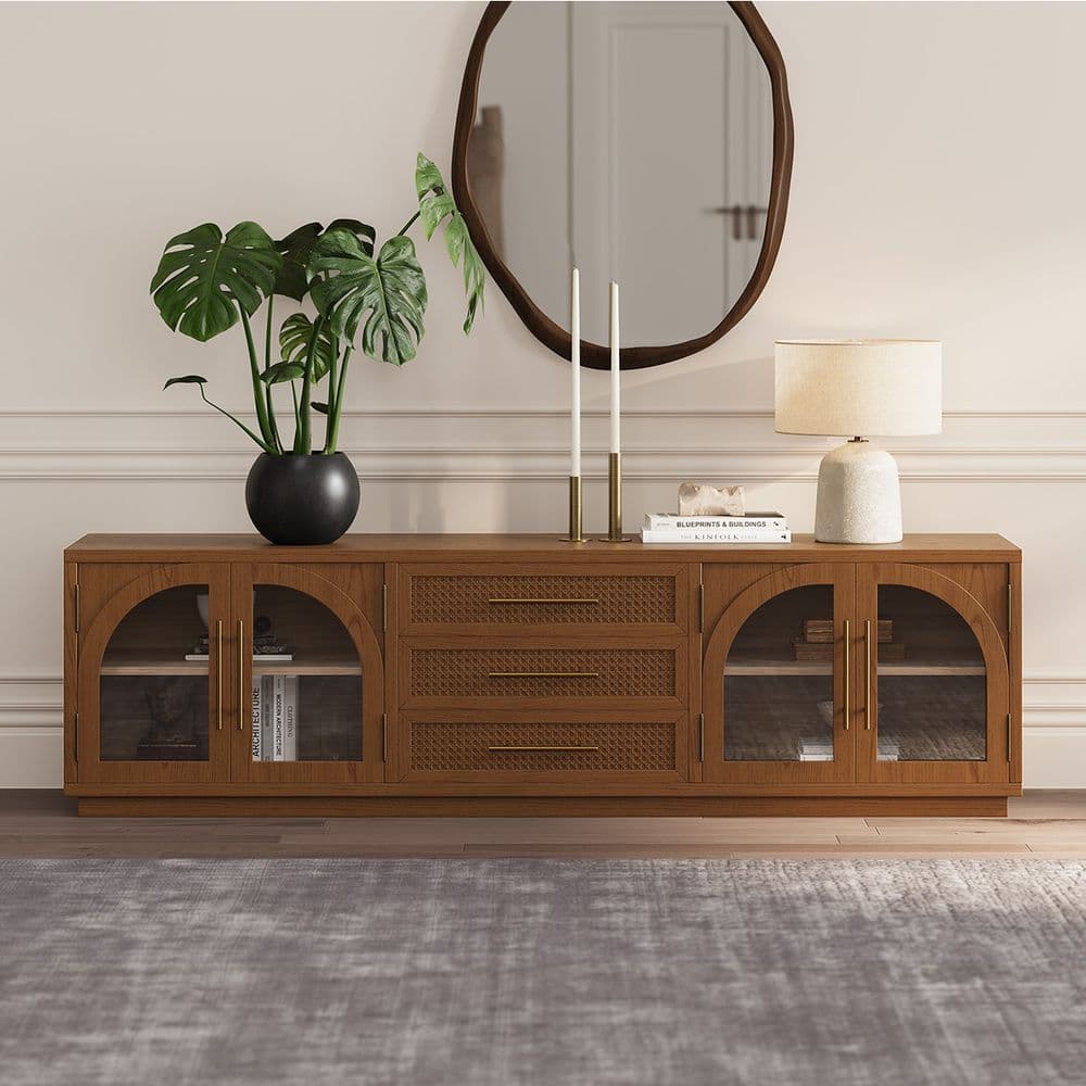 This brown TV stand is made of good materials, and the arch cabinet doors on both sides show the classic design style of the mid-century period for up to 75 Inch TV. 2 cupboards and 3 drawers provide ample space for living room miscellaneous items.