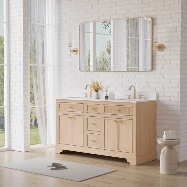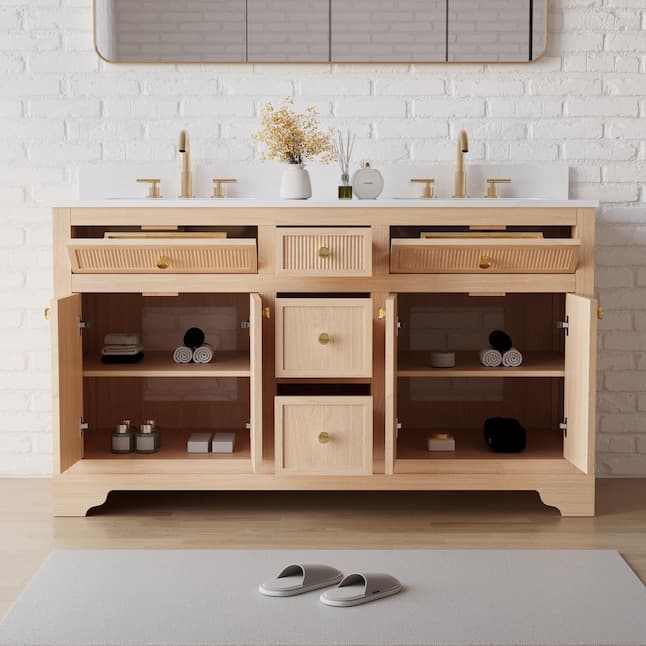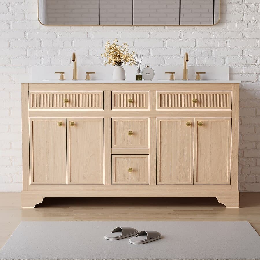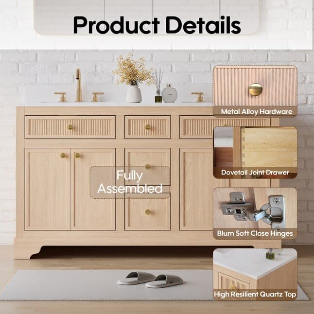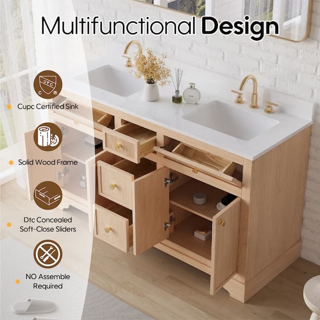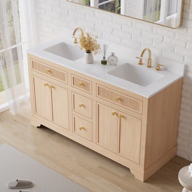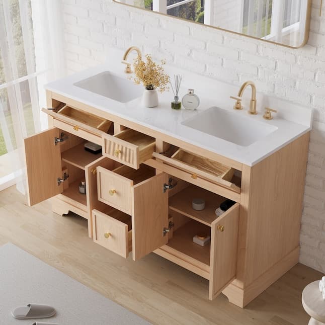 Enhance your bathroom with the 60-inch Light Wood Bathroom Vanity, designed for both elegance and practicality. Constructed with a solid poplar wood frame and high-quality veneer plywood, this freestanding vanity promises durability and timeless appeal. The luxurious vanity top, crafted from high-quality quartz or natural Italian Carrera white marble, offers a nonporous, scratch- and stain-resistant surface. With two 20-inch undermount rectangle sinks, pre-drilled for 8-inch widespread faucets, and a 4-inch backsplash, this vanity combines functionality with sophisticated design. It includes four soft-close doors with Austria BLUM hinges, three dovetail drawers with DTC soft-close sliders, and two flip drawers for ample storage. Fully assembled with adjustable height levelers, this vanity ensures easy installation and a perfect fit for any bathroom space.