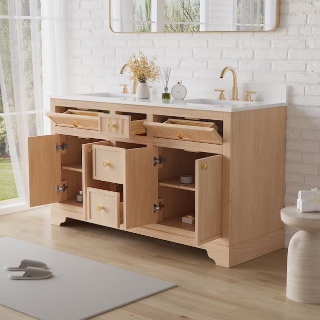 WELLFOR ALLSTAR Solid Wood Bathroom Vanity 60-in Oak Undermount Double sink Bathroom Vanity with Carrera white Quartz Top