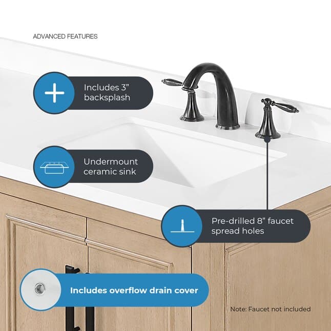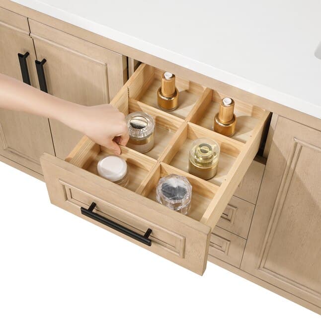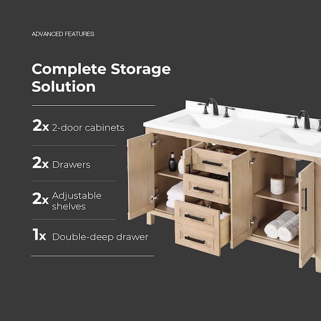 Add a lot of classic style to your bathroom with tasteful trim and high-quality materials of the 60-inch Nyall double vanity from OVE Decors. Ample storage includes 2 double-door cabinets, 2 adjustable interior shelves and 2 drawers to meld fashion with function, making the most of small-footprint spaces. A clean white engineered quartz countertop and brushed nickel hardware lend timeless appeal and keep your vanity looking contemporary for years to come.