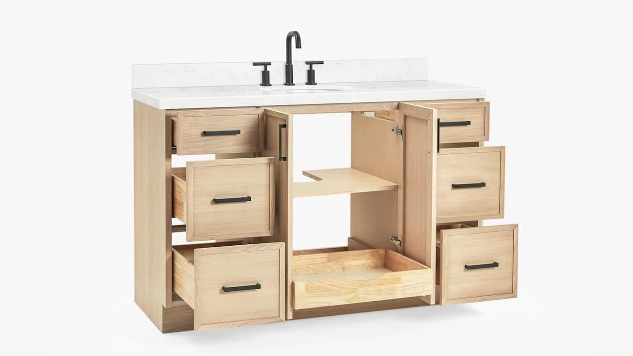 Change the entire look and feel of your bath area with ARIEL Kelly Single Sink Bath Vanity in White Oak with Carrara White Quartz Top.