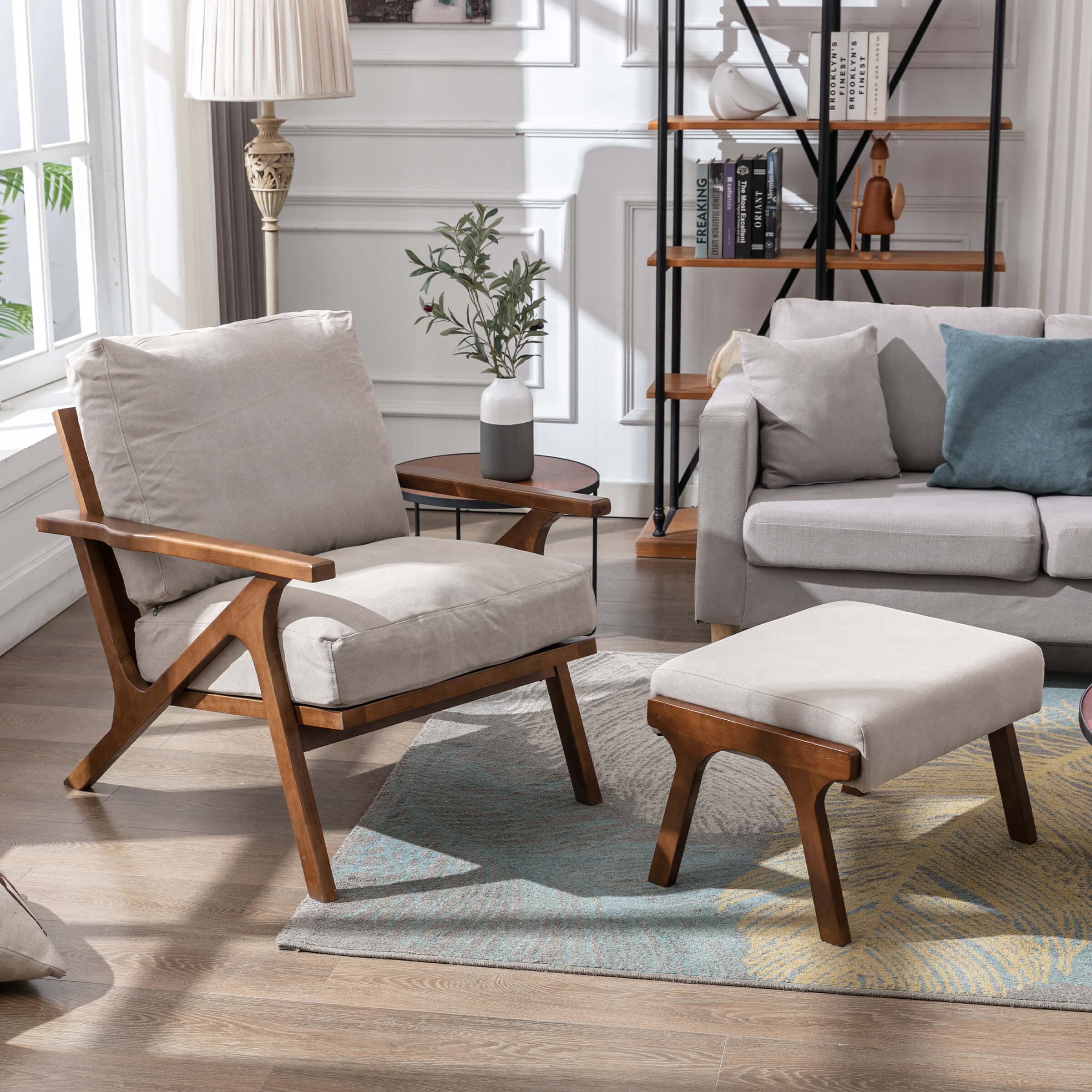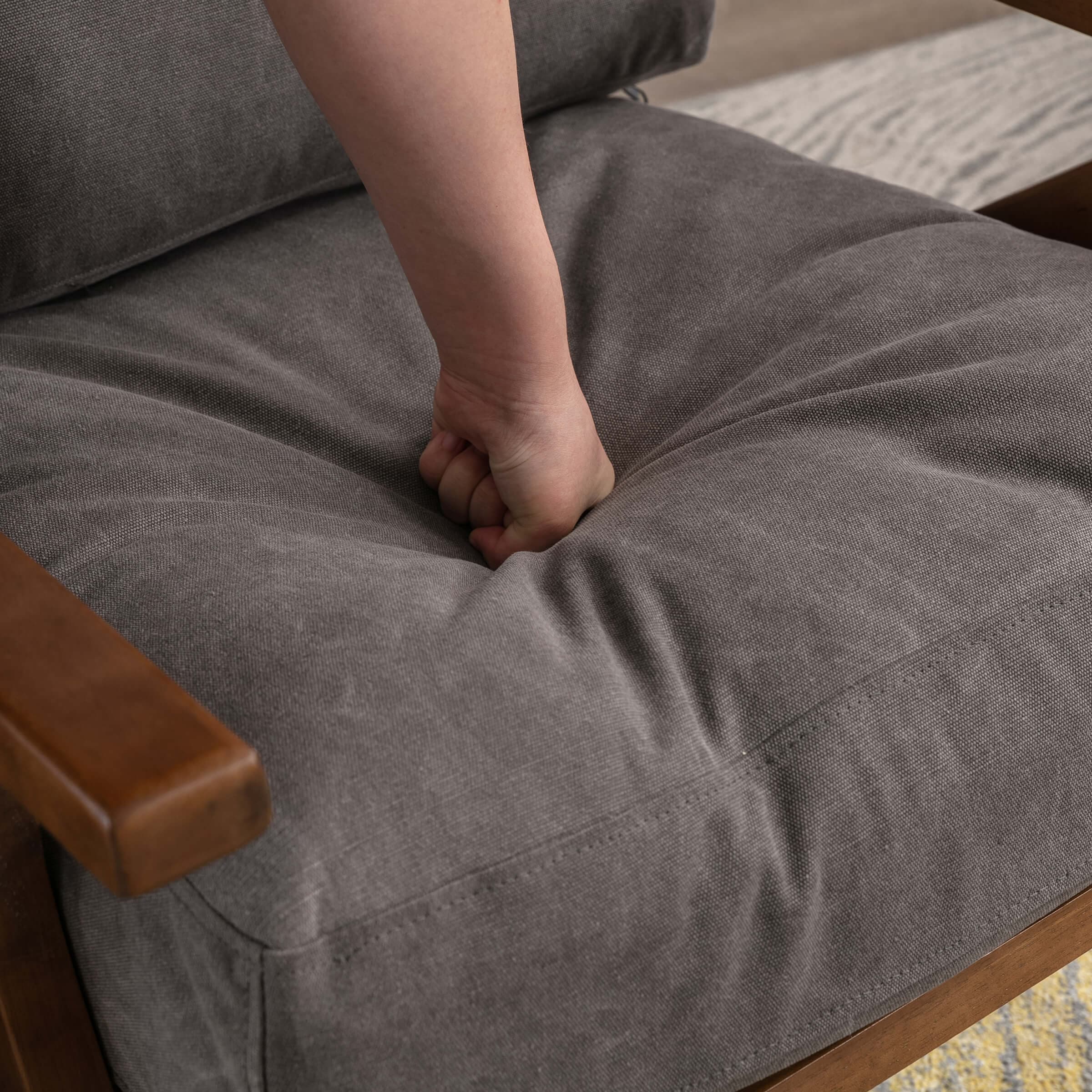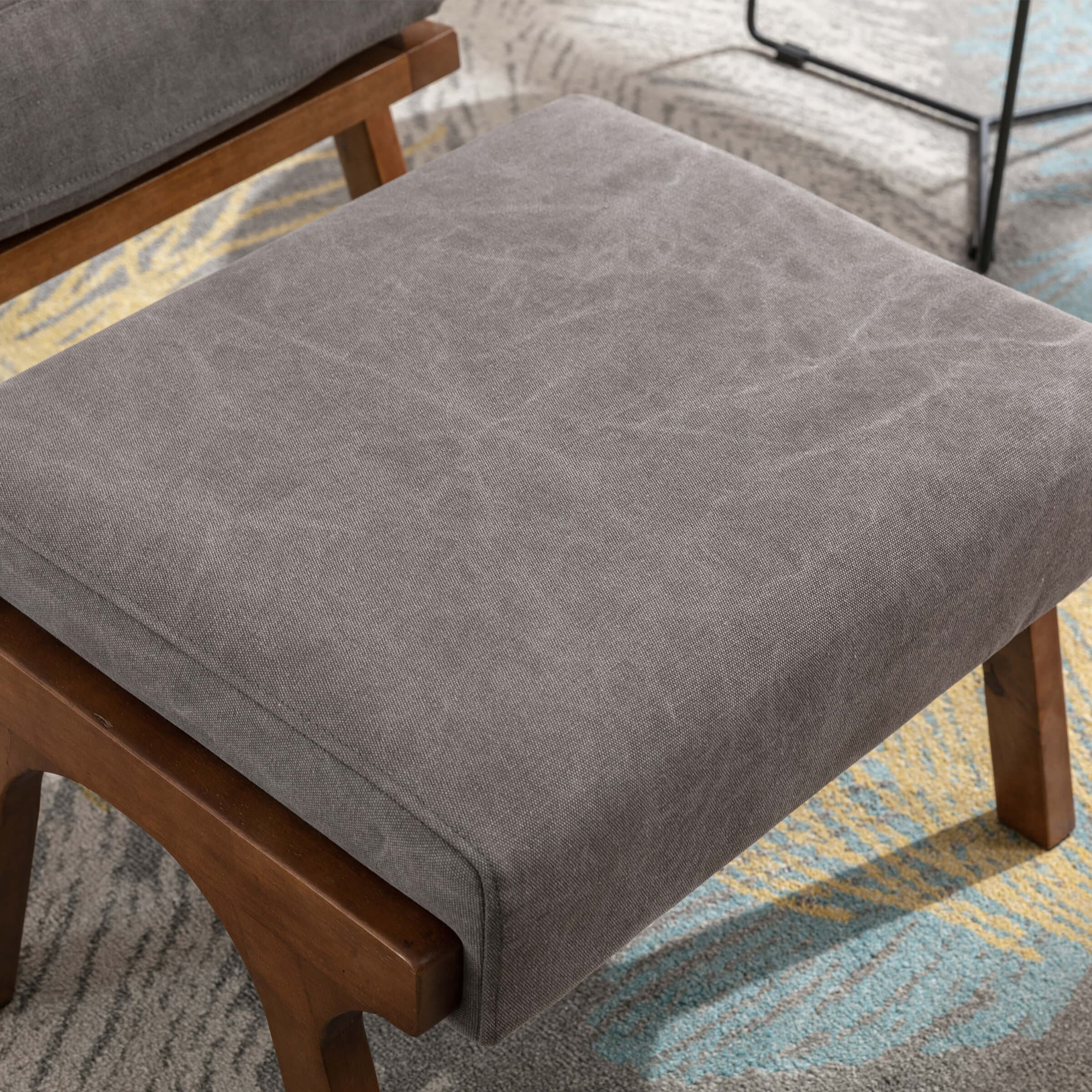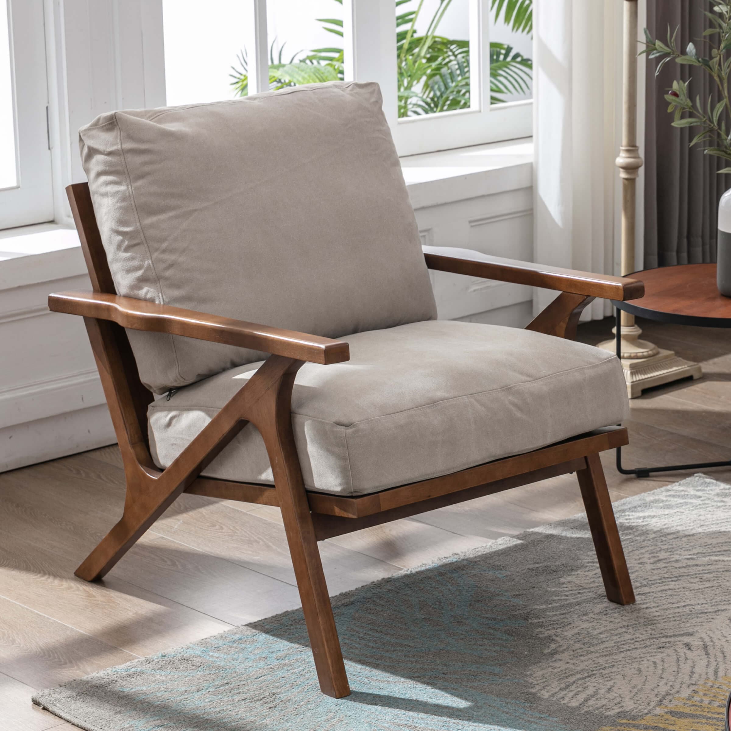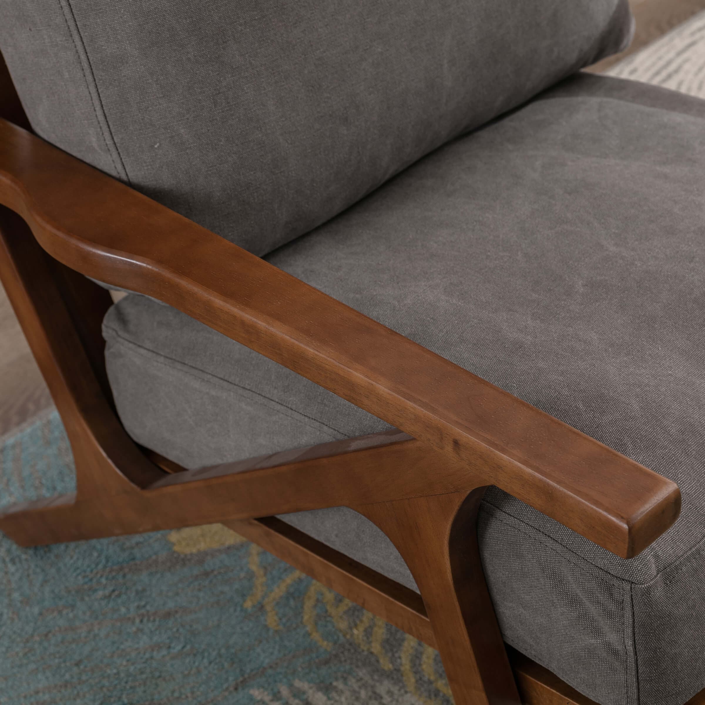 Mid-century lounge chair, two super soft cushions are upholstered in a denim fabric which is more breathable and durable than ordinary fabrics. Both backrest and seat cushions are REMOVABLE CONVENIENT CLEANING. The covers of cushions are REMOVABLE TOO and they can be cleaned separately. Dark walnut solid wood frame makes this accent armchair fit most of the contemporary interior decor, living room, bedroom or reception office. Total size: 29.92"D x 32.68"W x 33.46"H. Perfect choice for you to sit on when you are playing with your phone or reading a book. Assembly required. Free return for any quality problem of our leisure chair. If you have any problem please feel free to contact us, we'll reply you within 24 hours.