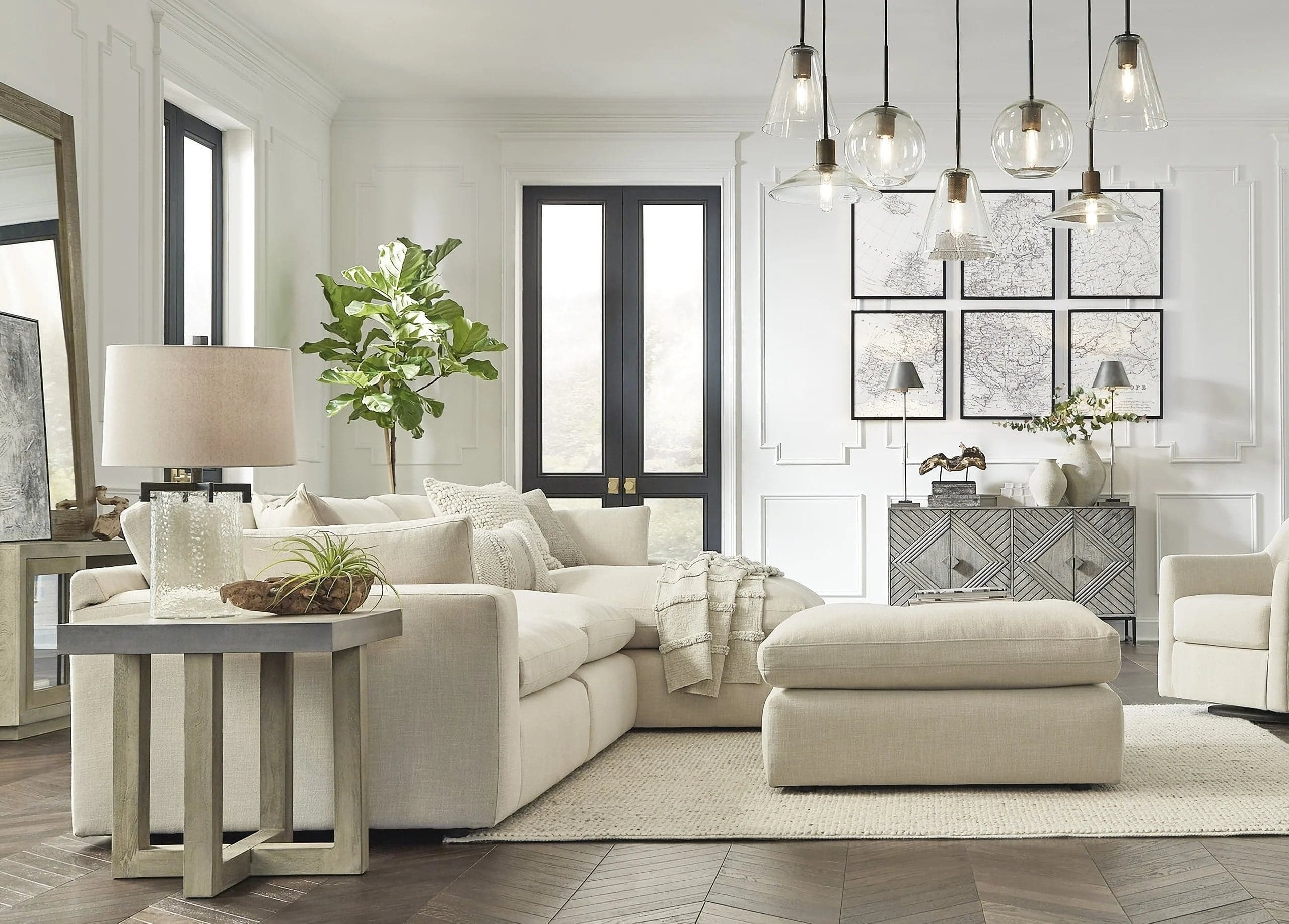 Includes 3 pieces: left-arm facing corner chair, armless chair and right-arm facing corner chaise. "Left-arm" and "right-arm" describe the position of the arm when you face the piece. Pieces can float anywhere; sides are finished (with no connectors). Corner-blocked frame. Loose reversible cushions. Seat cushions with feather-fiber blend encasing a foam core. Feather/fiber blend back cushions and bolster pillows. Polyester upholstery. Non-skid legs. Platform foundation system resists sagging 3x better than spring system after 20,000 testing cycles by providing more even support. Smooth platform foundation maintains tight, wrinkle-free look without dips or sags that can occur over time with sinuous spring foundations.