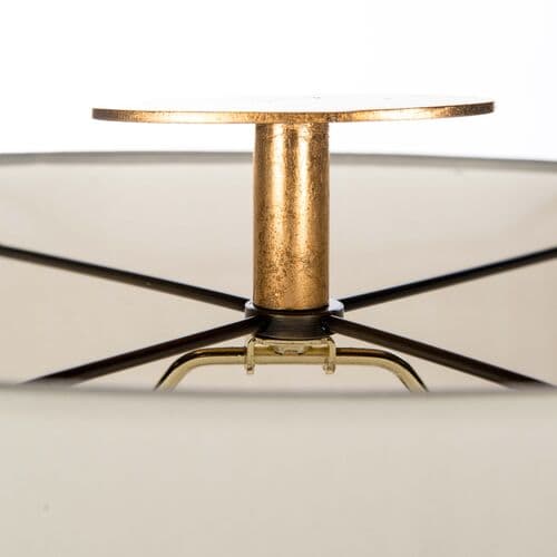 Asymmetrical with a modern flair, this contemporary table lamp features a slanted oval base accented with a gold leaf finish iron band. Matching the band of the unique slant base is a complementing iron rectangular foundation with four square feet. Cast a lovely glow in a modern home with an oval softback shade wrapped in a cream colored fine linen.