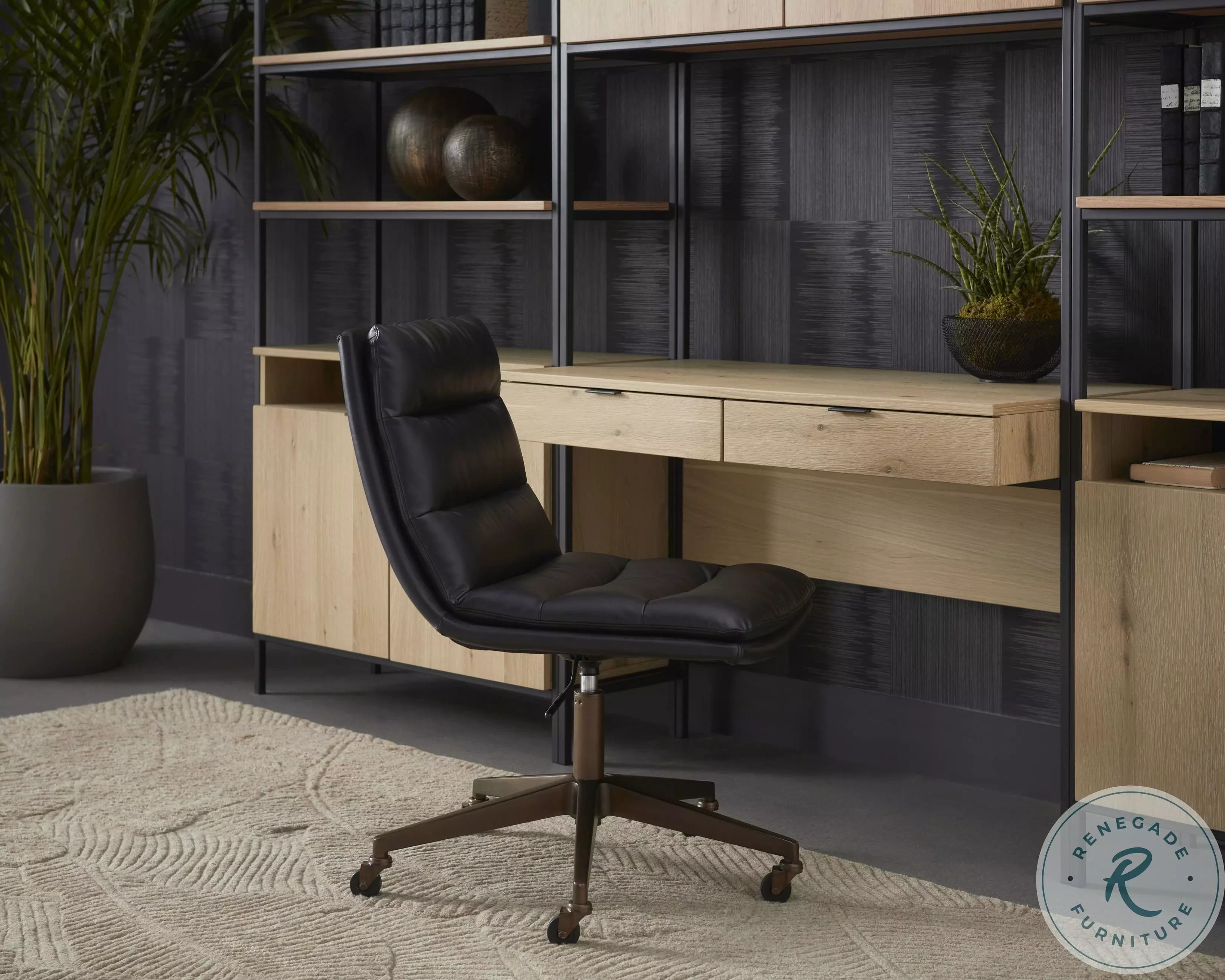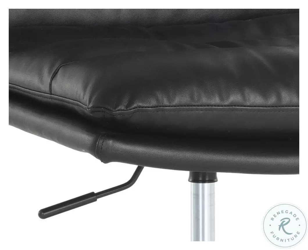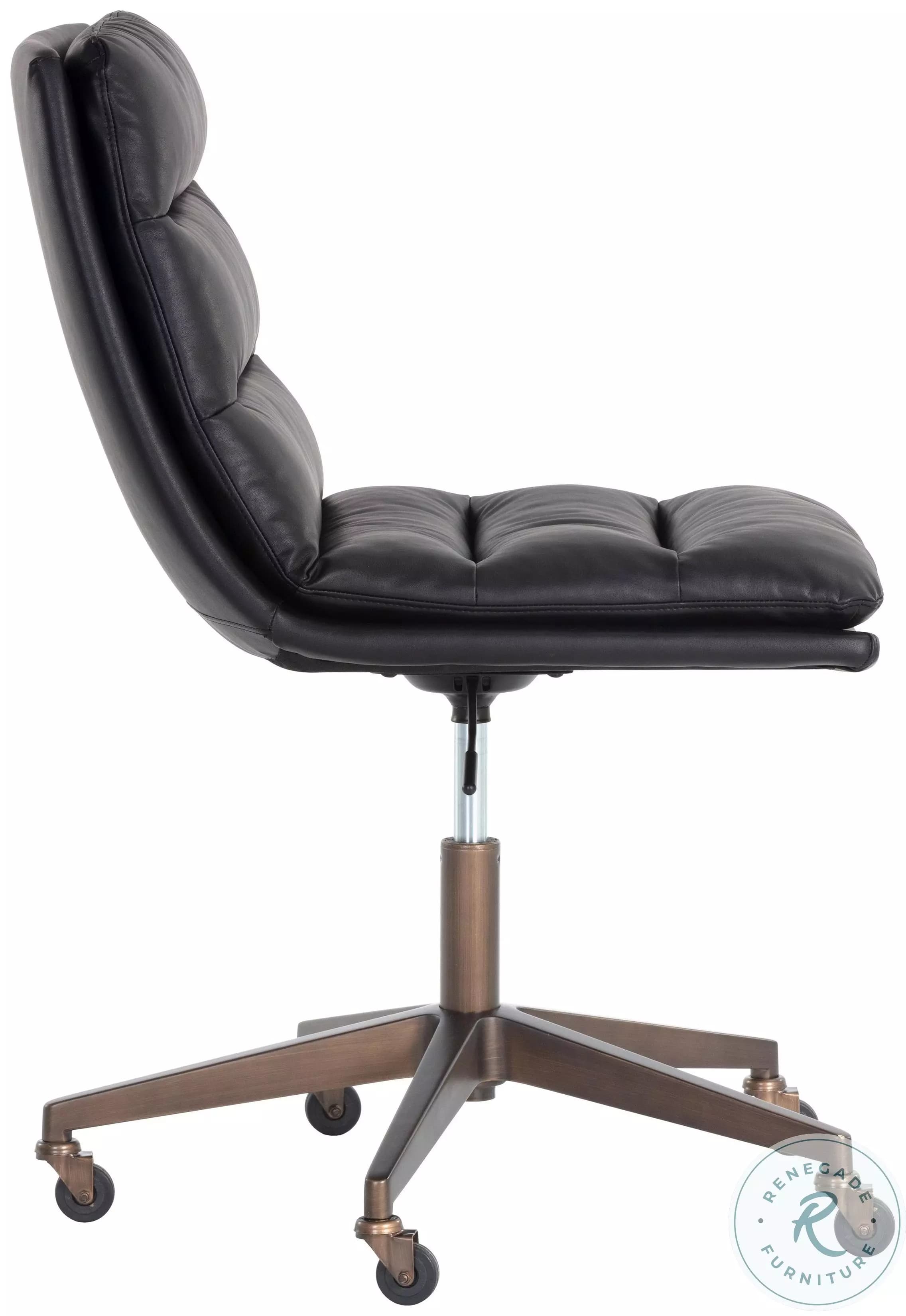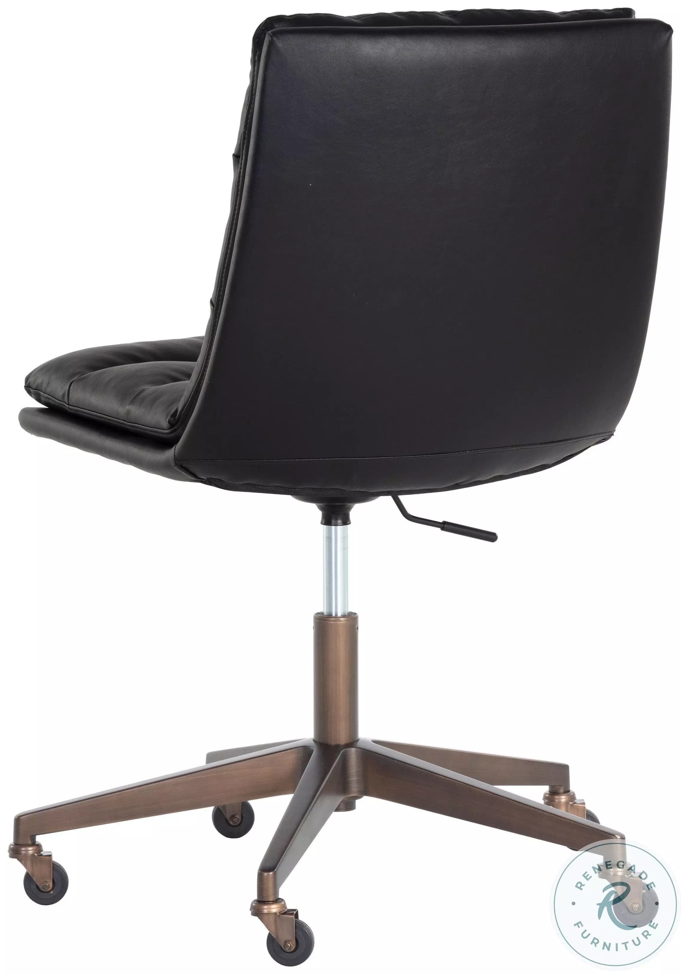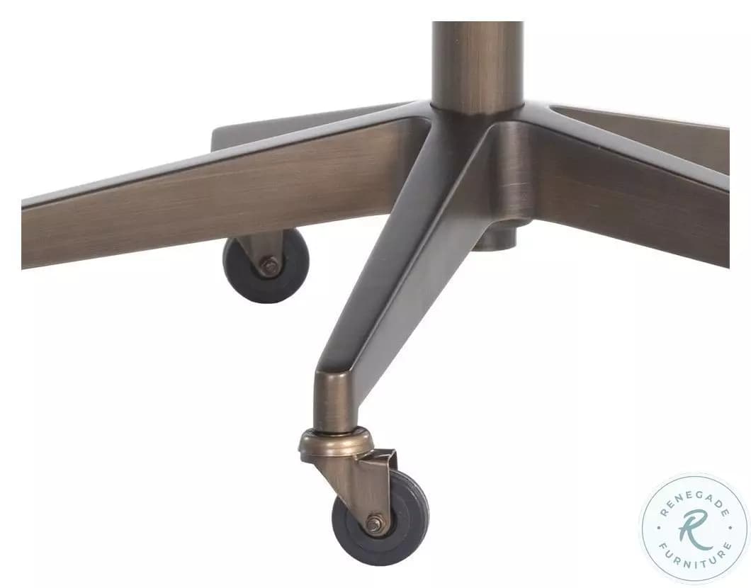Work in maximum comfort with this mid-century modern office chair that features a generously-padded backrest. Stocked in bravo black faux leather. Completed with an antique brass steel base with added castors for mobility. Handle With Care: This design has been crafted with faux leather. Faux leather is manufactured to reflect the natural characteristics of leather; as such, colour variations, markings wrinkles, grooves, and light scratches are appreciated characteristics. No two pieces will be alike.