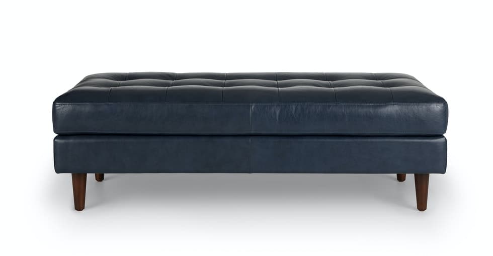 Blue Leather Bench, 56"W, Italian Leather, Tufted Seat, Walnut Legs, Mid-century Design | Sven Collection | Article Modern Furniture. Whether it’s in the entryway, as extra seating in the living room, or a cushy perch for the end of the bed — the Sven Bench is our beloved sofa motif reimagined just a little flatter.