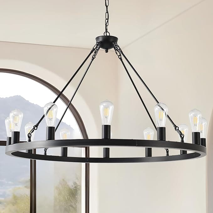 ZBMYRBZJ 40” Farmhouse Wagon Wheel Chandelier, Black Rustic Chandelier 12-Lights Round Dining Room Light with Adjustable Height, Industrial Ceiling Light Fixtures for Kitchen, Foyer, Porch, Living Room