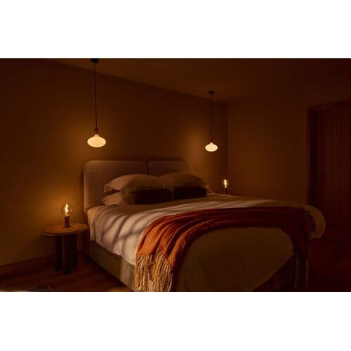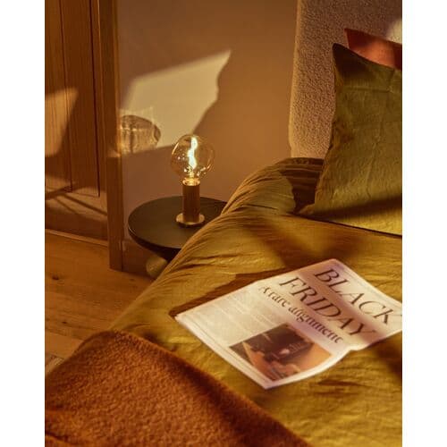 Hand-turned, FSC-certified oak forms the base of this lamp, supporting a bulb crafted from mouth-blown glass. The bulb's spiral filament reflects the Fibonacci sequence, offering an artistic touch. Equipped with a dimmer, the lamp allows for mood adjustment.