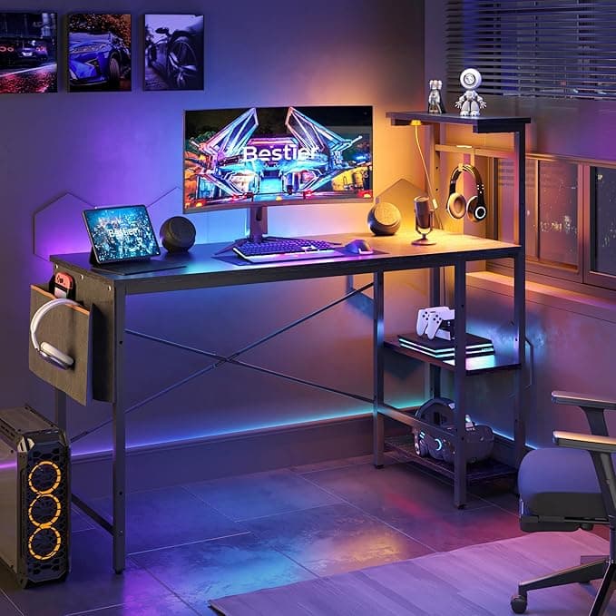 Buy Bestier Gaming Desk with LED Lights, 51.3 Inch Computer Desk with 4 Tiers Reversible Shelves, Home Office Writing Desk with Side Storage Bag, Hooks and Height Adjustable Shelf (Black Grained): Home Office Desks - Amazon.com ✓ FREE DELIVERY possible on eligible purchases