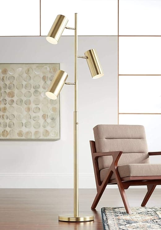 Possini Euro Design Canasta - Lámpara de pie moderna de mediados de siglo, 3 luces de 67 pulgadas de alto, latón satinado, dorado, ajustable, pantalla de metal, decoración para sala de estar, lectura,