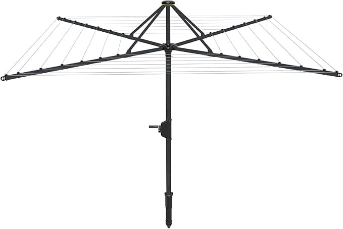 Daytek MK2 Rotary Clothesline offers large overall line space and the best outdoor drying solution for large spaces. Featuring three installation heights, it comes with pre-strung and pre-tensioned lines and a ground mount socket. The rotary head can be folded down and the entire clothesline can be easily removed for storage when not in use, giving back valuable yard space. Manufactured from high tensile galvanized steel tube and powder coated in a light gray color, the Daytek Rotary Clothesline has 7 lines and 157 feet of drying space.