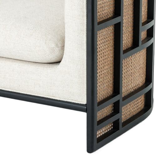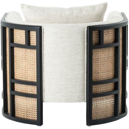 Made from rubberwood with a barrel design, geometric frame, and cane paneling, this club chair adds charm to any room. Generously padded cushions provide a comfortable sitting experience.