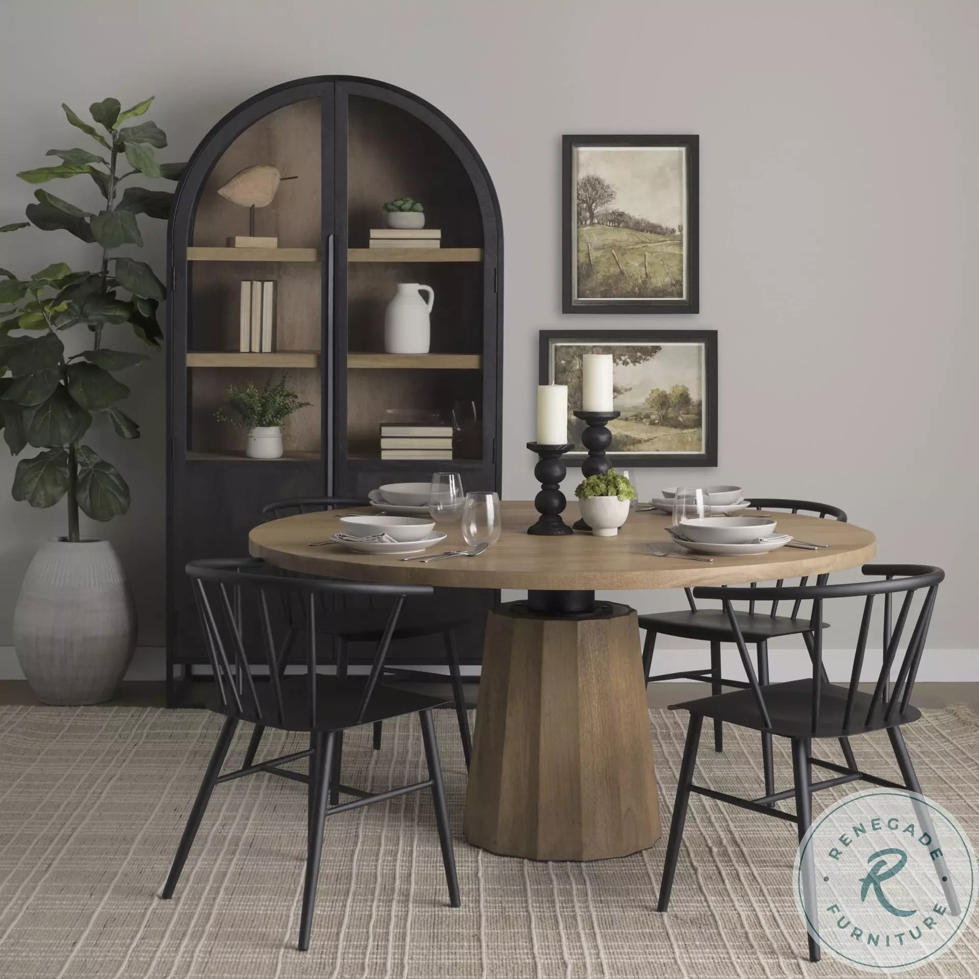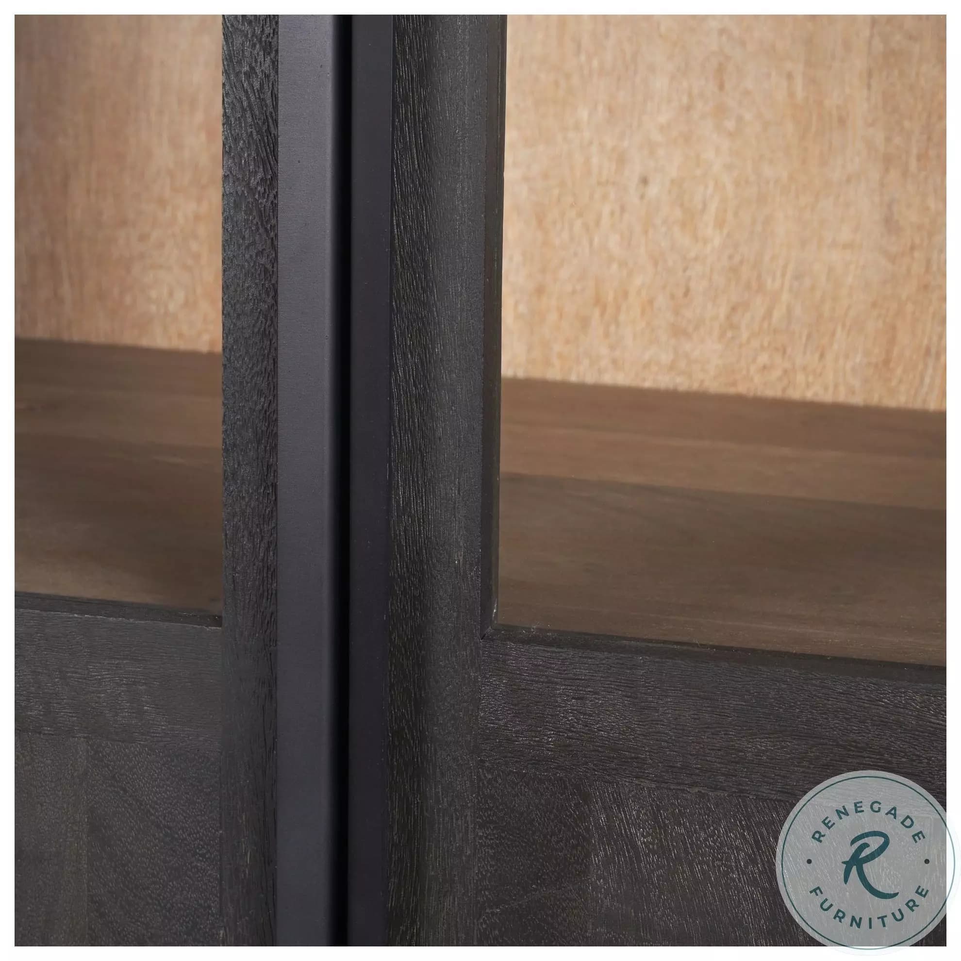 Sloan is a captivating arched curio cabinet meticulously crafted from solid mango and black iron. Its striking two-toned finish accentuates the elegant arch, with a sleek black frame and blacken door exterior contrasting beautifully with a warm natural light brown stained interior. Display your seasonal and cherished items with sophistication and style behind the solid mango and clear glass doors.