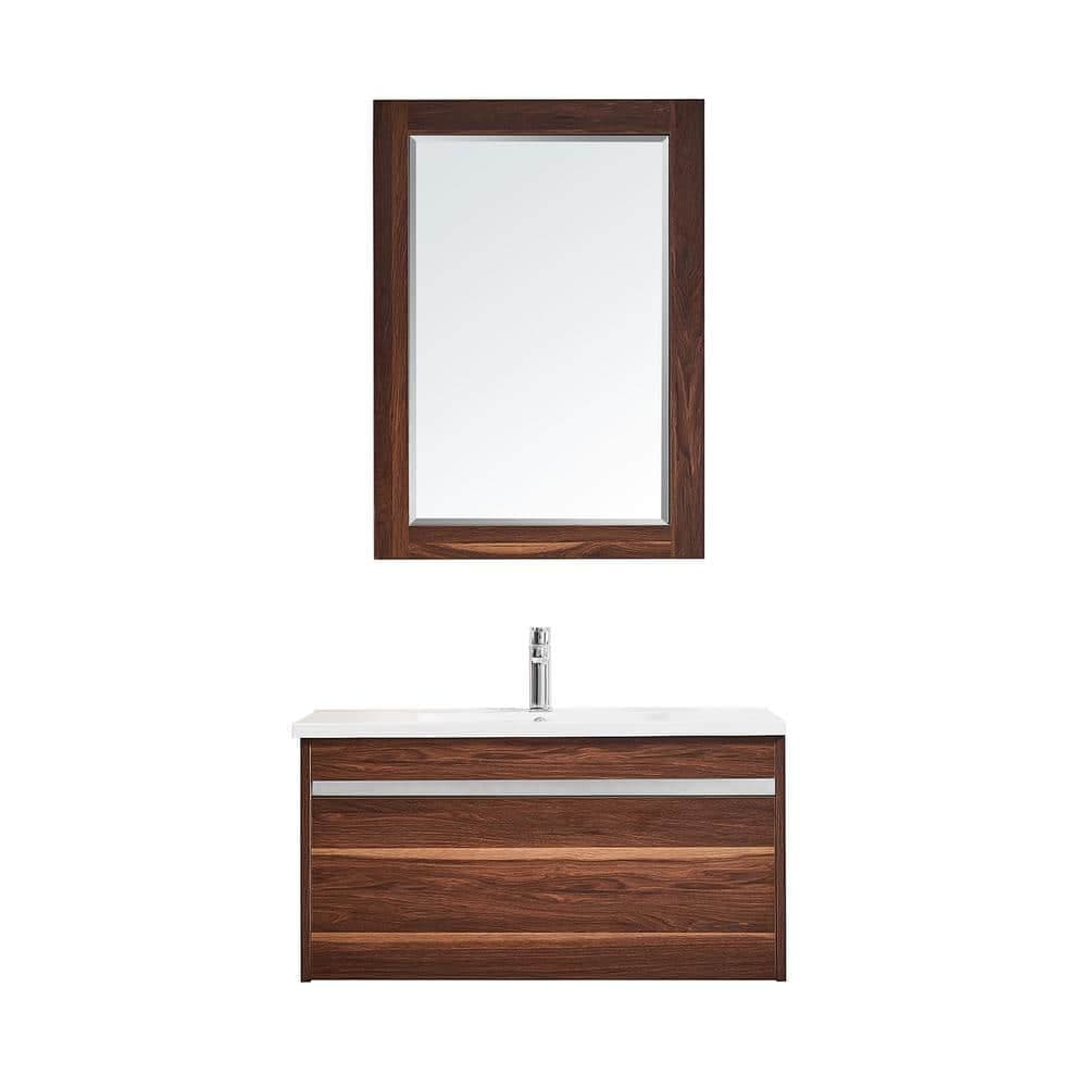 ROSWELL Thomas 35.4 in. W x 18.1 in. D x 18.7 in. H Bath Vanity in Walnut with White Sink Top and Mirror