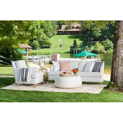 Exclusive to One Kings Lane: This style features an elegant track arm making it a perfect fit for any outdoor aesthetic. It is upholstered in an eco-friendly UV high-performance fabric which repels stains, spills, bacteria, and mold. Constructed of marine grade materials, an outdoor slat suspension system, and reticulated foam cushions featuring an open cell foam which allows the water to drain ensures comfort and easy maintenance. Each style includes a custom outdoor cover constructed of heavy duty canvas with elastic at the bottom to ensure a proper and snug fit. Each piece is handcrafted by skilled artisans in High Point, NC.