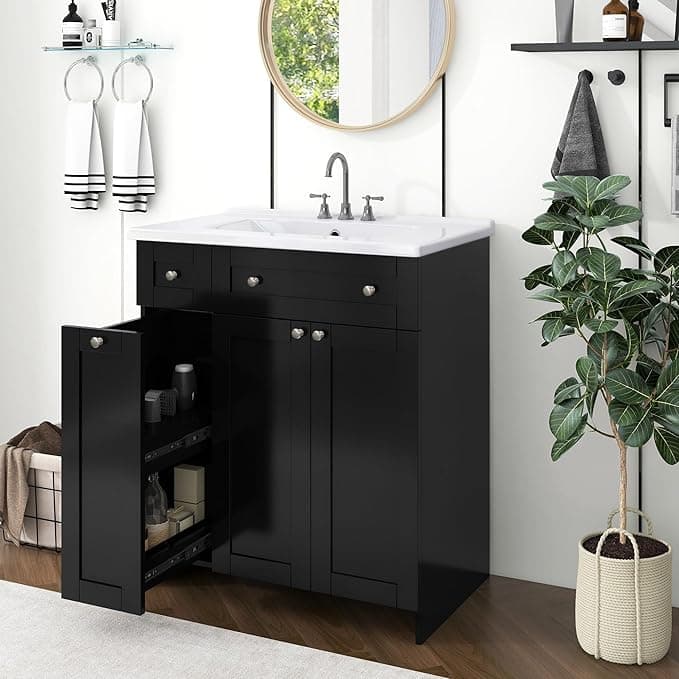 Luckiofvonne 30" Bathroom Vanity with Sink, Bathroom Vanity Storage Cabinet with 2 Soft-Close Doors and Double-Tier Deep Drawer, Undermount Ceramic Sink with Thickened Wood, Black