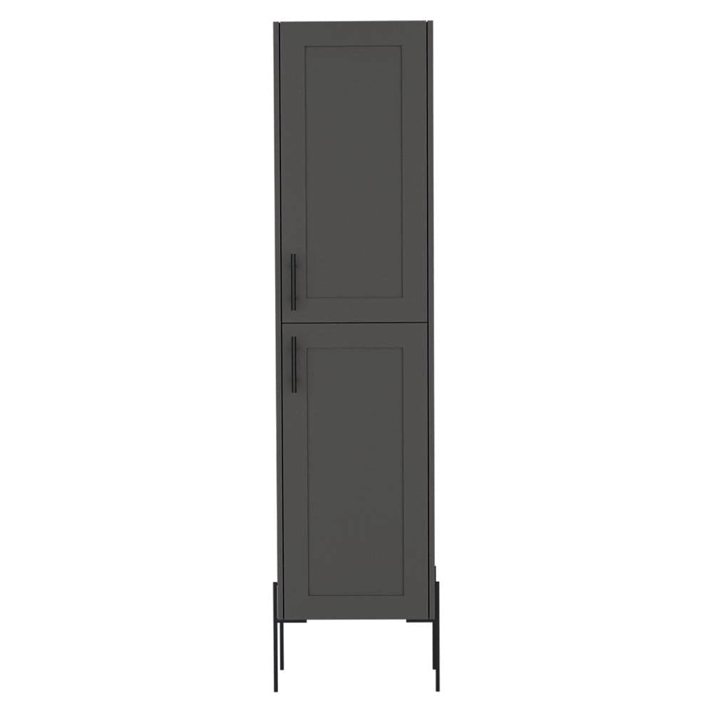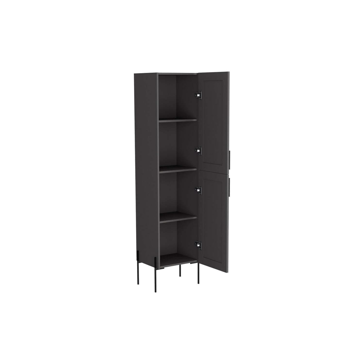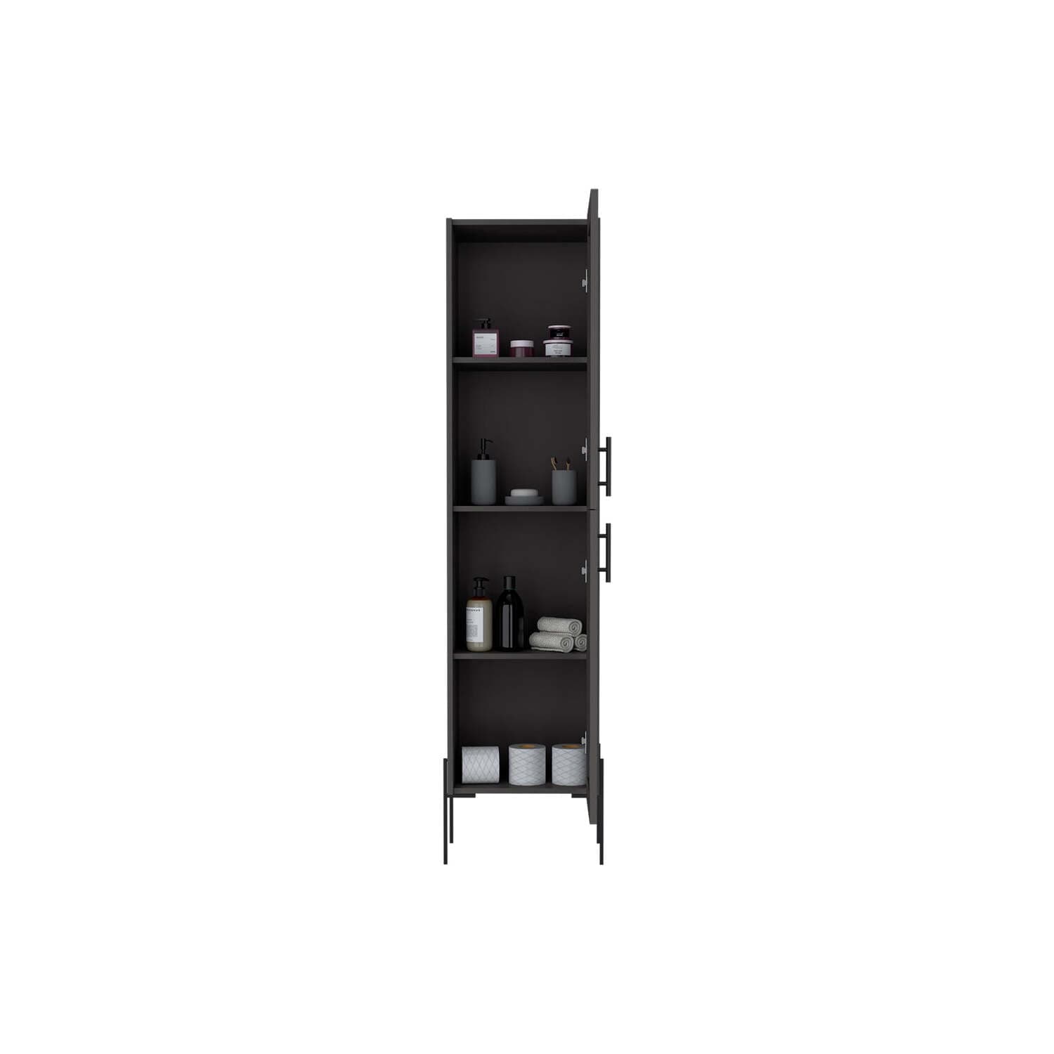 The Linen Cabinet Hopewell is the perfect blend of functionality and modern design for your bathroom. Crafted from durable smoke-finished manufactured wood, this tall cabinet offers ample storage with two superior compartments. The upper cabinet features a superior shelf measuring 14.3"H x 15.5"W and an inferior shelf at 15.6"H x 15.5"W. The lower cabinet mirrors this design providing plenty of space to organize your linens, toiletries, and other essentials. Each door has a sleek metal handle, adding a contemporary touch, while the four sturdy metal legs ensure stability and elevate the cabinet's overall aesthetic.