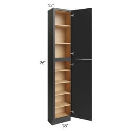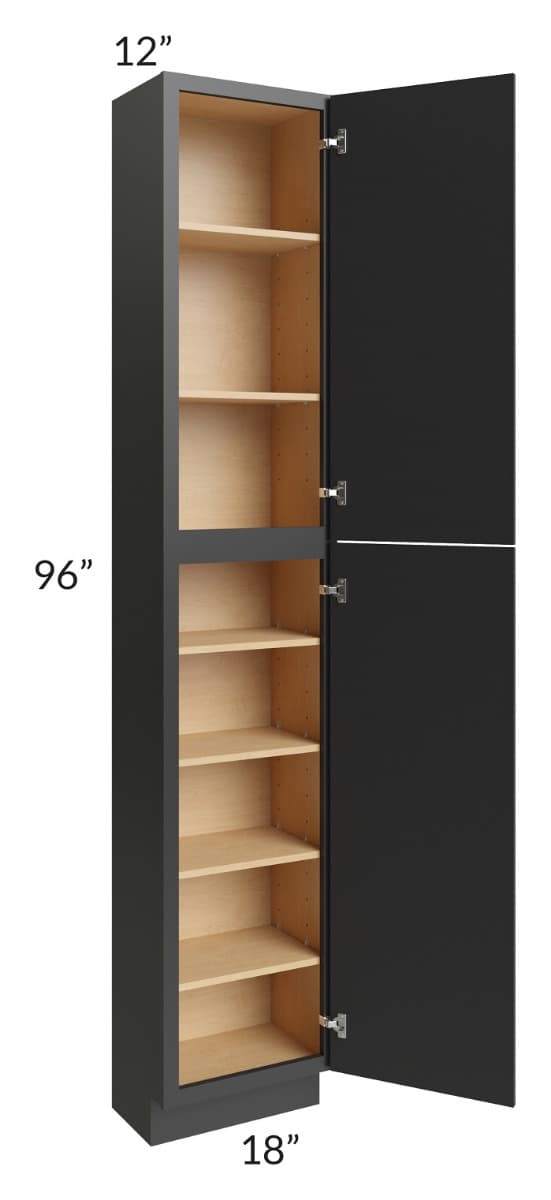 Width 18" | Height 96" | Depth 12" Pantry cabinet that will have 2 doors; 1 shorter door on top and 1 taller door on bottom. The top door is 41-1/2" high and the bottom door is 49-1/4" high. There are 6 shelves that are 10-5/8" deep.