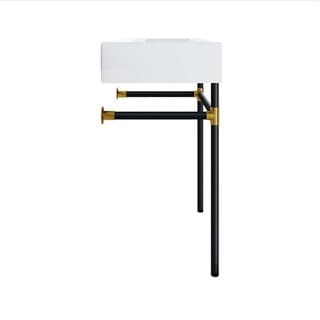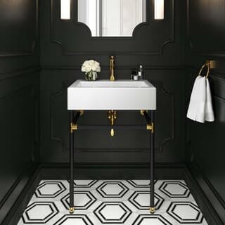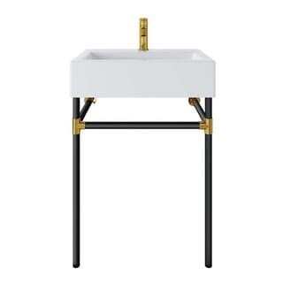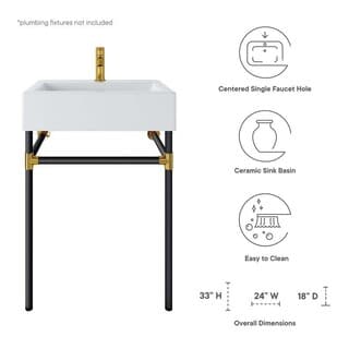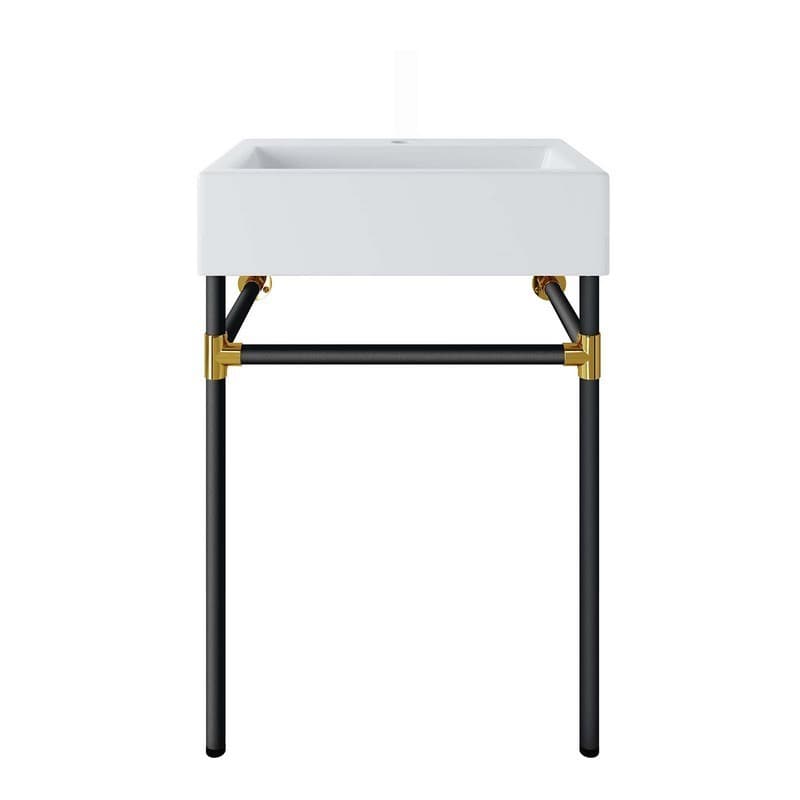 Create a bathroom oasis with the minimalist style and efficiency of the Redeem Wall-Mount Black Stainless Steel Bathroom Vanity. The glossy white ceramic basin and robust stainless steel frame affix directly and securely to the bathroom or powder room wall. Redeem dispenses gentility in spaces large and small, resting confidently on a sturdy black metal frame with gold joints for added stability. This small bathroom vanity has a single faucet hole and is outfitted with non-marking foot caps to protect your bathroom floor. Assembly required and fixtures not included.
