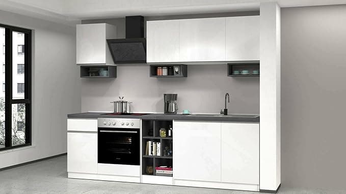 Cuisine complète – Cuisine pratique et peu encombrante, mur de cuisine avec 7 portes et 1 tiroir, 100 % fabriqué en Italie, 255 x 60 x 85 cm, blanc brillant et ardoise. Structure et utilisation – Cuisine complète pratique et peu encombrante, structurée avec sept portes battantes, un tiroir et neuf compartiments ouverts – Les portes et le tiroir sont équipés de poignées en aluminium encastrées et de fortes charnières - La partie supérieure est idéale pour accueillir des assiettes, des vaisselles, des verres – La partie inférieure est adaptée pour ranger un garde-manger, des appareils électroménagers ou des casseroles – Cet article d'ameublement est parfait pour décorer votre cuisine ou salle à manger, en contenant de manière ordonnée tout le nécessaire. Fabriqué en Italie – L'article est fabriqué en Italie, avec l'utilisation des meilleurs matériaux et la plus haute qualité et soin dans les détails – L'attention des processus de production est synonyme de fiabilité, résistance et raffinement. Fabriqué en Italie. de pleine conformité aux normes de l'Union européenne. Caractéristiques techniques - Décoration entièrement construite avec des panneaux en mélamine épaisseur 16/35 mm, elle est résistante aux chocs et aux rayures, et est durable dans le temps - Nettoyage facile et rapide grâce au matériau dont il est composé - Livré démonté avec kit et livret d'instructions de montage, pour un total de 14 colis - attention particulière à l'emballage, résistant et adapté au transport - Évier en acier inclus.