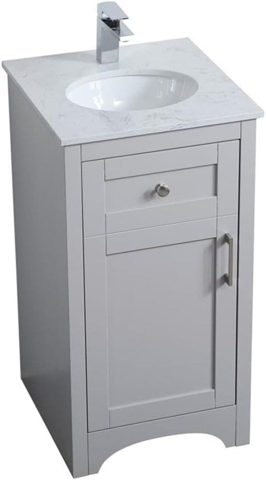 The refined simplicity of this 18" gray finish vanity creates a peaceful, yet stylish, atmosphere. Its traditional modernity adds a mature beauty that will elevate any bathroom or powder room--the Calacatta quartz counter top adds refined luxe while the brushed nickel handle bars open the single cabinet door, revealing ample storage space to store and hide away an assortment of bathroom essentials. Whether your home is large or small, this vanity will surely fit in well.