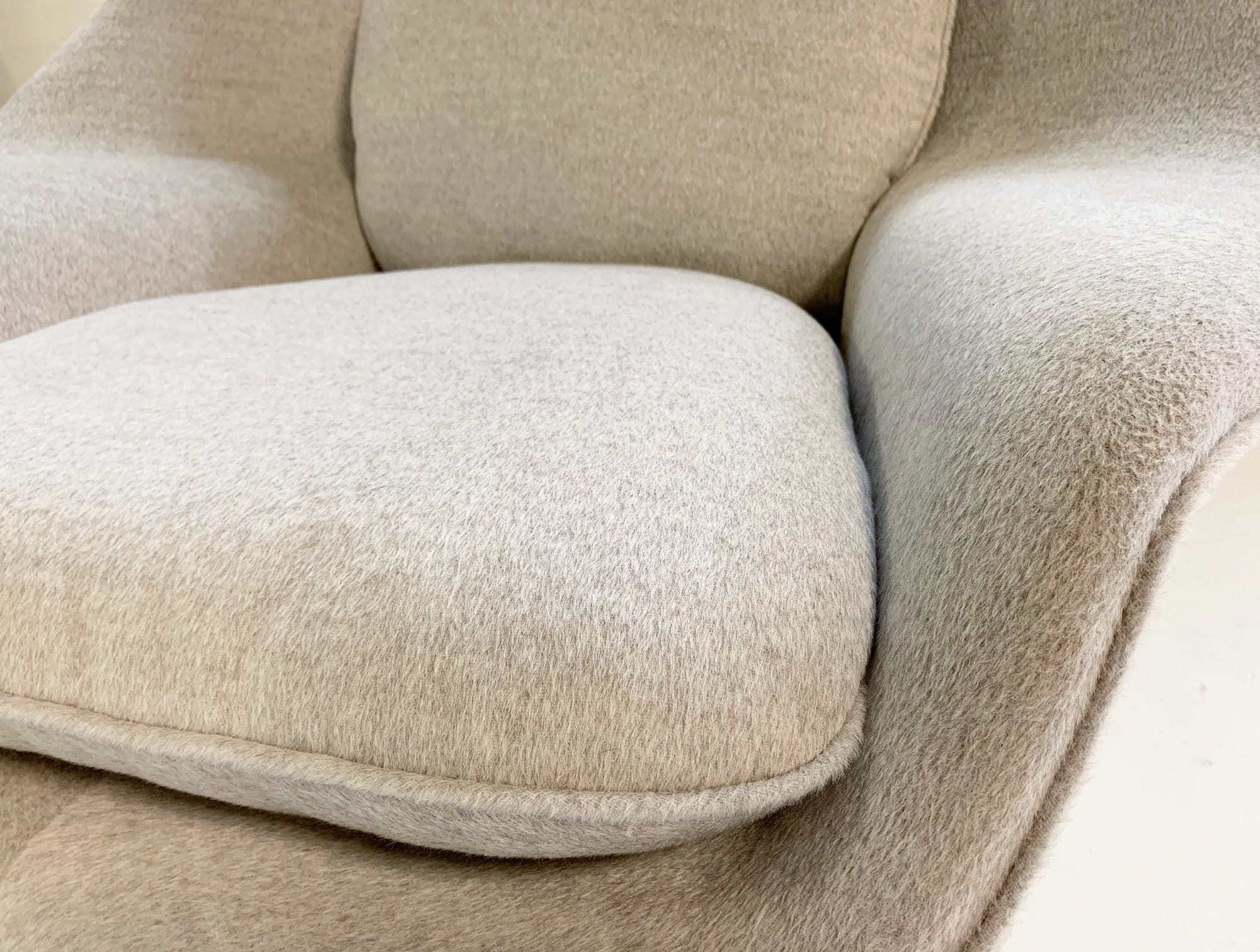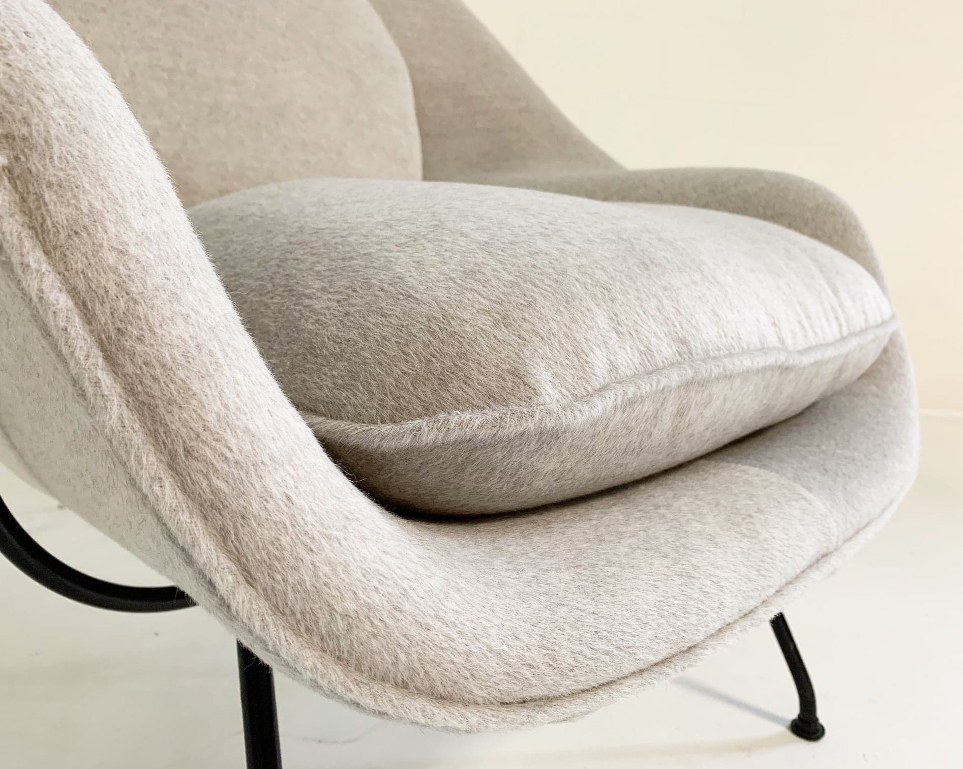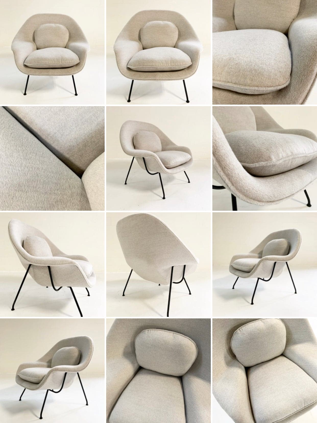 A favorite of the Forsyth design team! We collected this beauty for its icon status. “Eero Saarinen designed the groundbreaking Womb Chair at Florence Knoll's request for ‘a chair that was like a basket full of pillows - something she could really curl up in.’ This mid-century classic supports countless positions and offers a comforting oasis of calm hence the name.” —Knoll. Our master upholsterers went down to the bones of the chair, removing all old foam and replacing with new foam. Luxurious down feathers generously fill the back and seat cushions. Our designers chose beautiful Loro Piana alpaca wool for upholstery. Why We Love This Material | This beautiful fabric is the pinnacle of luxury. We love the long fibers that mimic the look of a natural hair on hide. And the alpaca wool blend is just as soft as cashmere. This colorway, the light grey, resembles that of a very fine Italian-made men's suit.