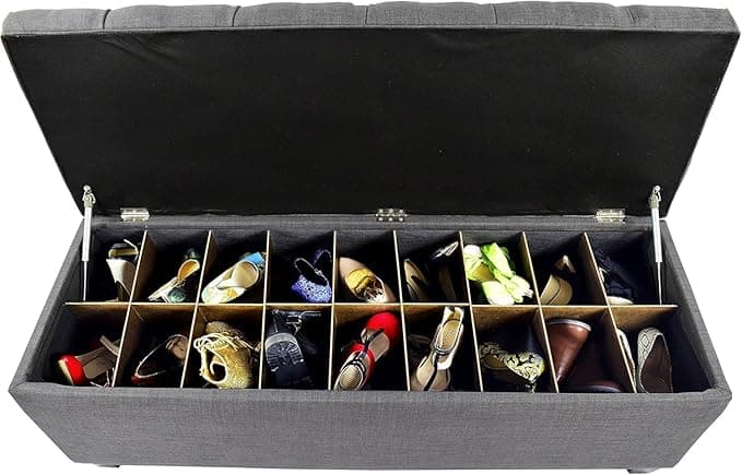 Transform your home with The Sole Secret Living Room or Bedroom Bench with Storage, a perfect blend of style and practicality. This upholstered shoe bench with storage is an ideal addition to any bedroom, serving as a chic end of bed bench that doubles as a bedroom storage solution. Designed to eliminate clutter, this bedroom bench features 14 to 18 removable shoe slots, perfect for organizing footwear, handbags, or miscellaneous items. Each insert can hold up to Men's Size 12 or Woman's Size 14 comfortably. Its elegant design and medium comfort level make it a versatile piece for any room, including the living room or mudroom.