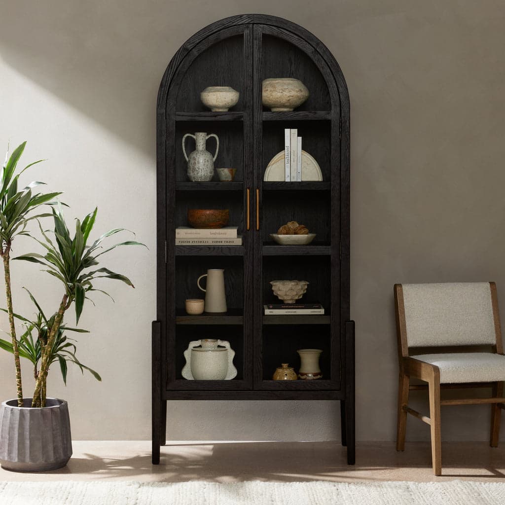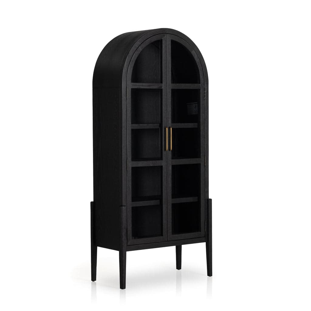 The Tuma Tall Cabinet is a beautifully shaped cabinet made from solid oak and features spacious interior shelving with clear glass fronts, ready for displaying favorite books, photos and treasures. The iron handles are finished in antique brass and the interior shelving is fixed. This piece is available in 3 finishes: solid black, natural oak, and black with natural oak interior. Also available in a solid door option.