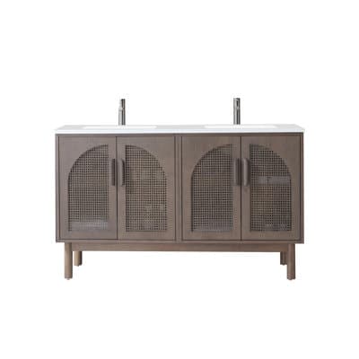 This vanity seamlessly combines classic and organic styles. The rattan paneling introduces a touch of texture and elegance to your bathroom. The pure white quartz countertop, with its rounded edges, is beautifully complemented by the graceful arch shapes. Smooth, naturally wood-toned door handles add to the refined look. Adjustable feet are included for added convenience, and the interior shelves provide ample storage for all your essentials. This vanity makes a sophisticated addition to any home. AllModern Base Finish: Brown