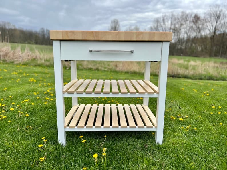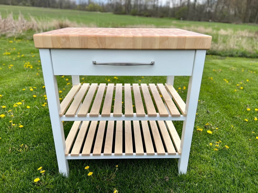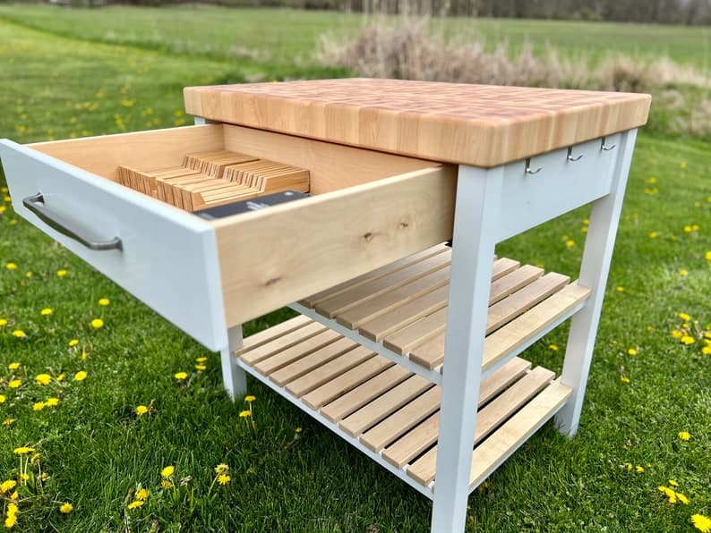 This Kitchen Storage item by AmericanWoodworksMI has 12 favorites from Etsy shoppers. Ships from Holt, MI. Listed on May 5, 2025. This butcher block kitchen island is made of solid Hard Maple and is built to be a functional cutting board in your kitchen. The island has two lower shelves and one large drawer for plenty of storage. All drawers come standard with Blum undermount, soft close drawer slides. Optional towel hooks can be added to the island as shown in the photos. Hardware can be chosen by the buyer and installed by our shop for a completed order upon delivery. The pictured top is constructed of end-grain standard Hard Maple and measures 2.75” thick. Clear Hard Maple (no spotting) White Oak, Hickory, Walnut, Beech, Cherry, Sapele and several other species are available. Please contact me for a custom quote. All tops come treated with a food safe product called “Walrus Oil” and the island ships with extra oil/ wax for maintenance.