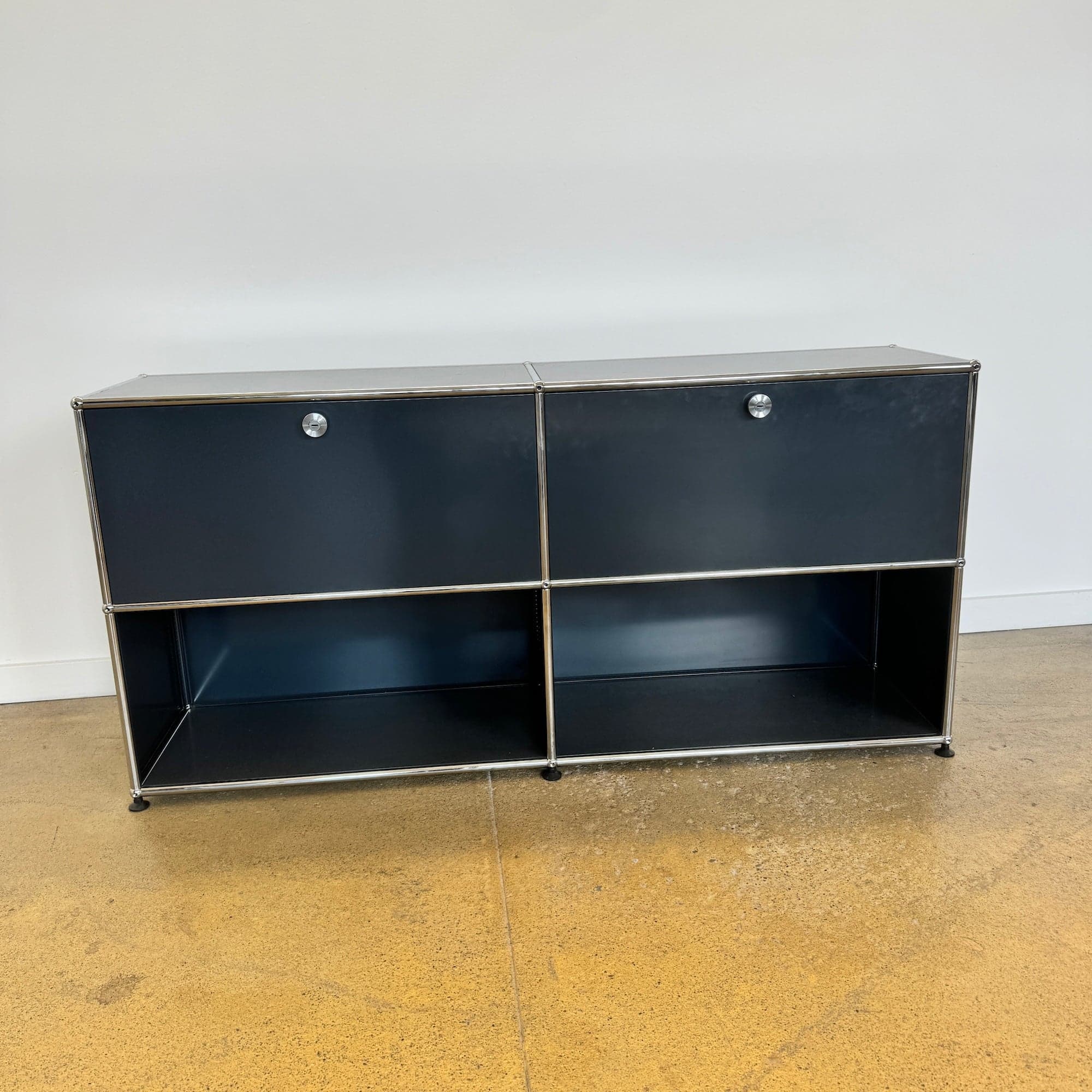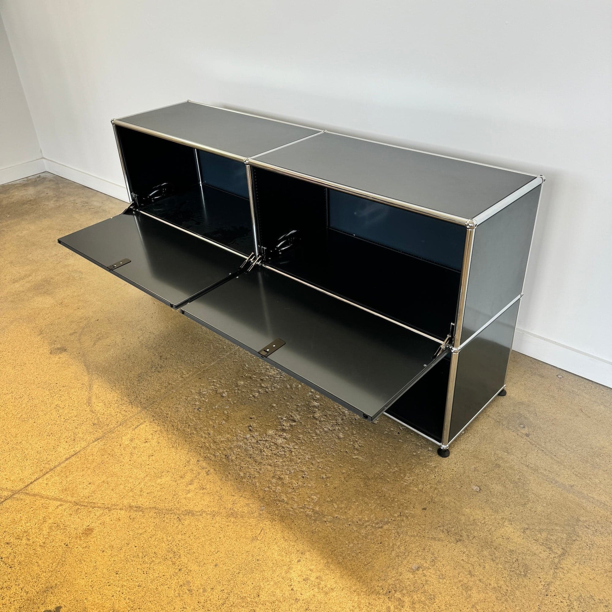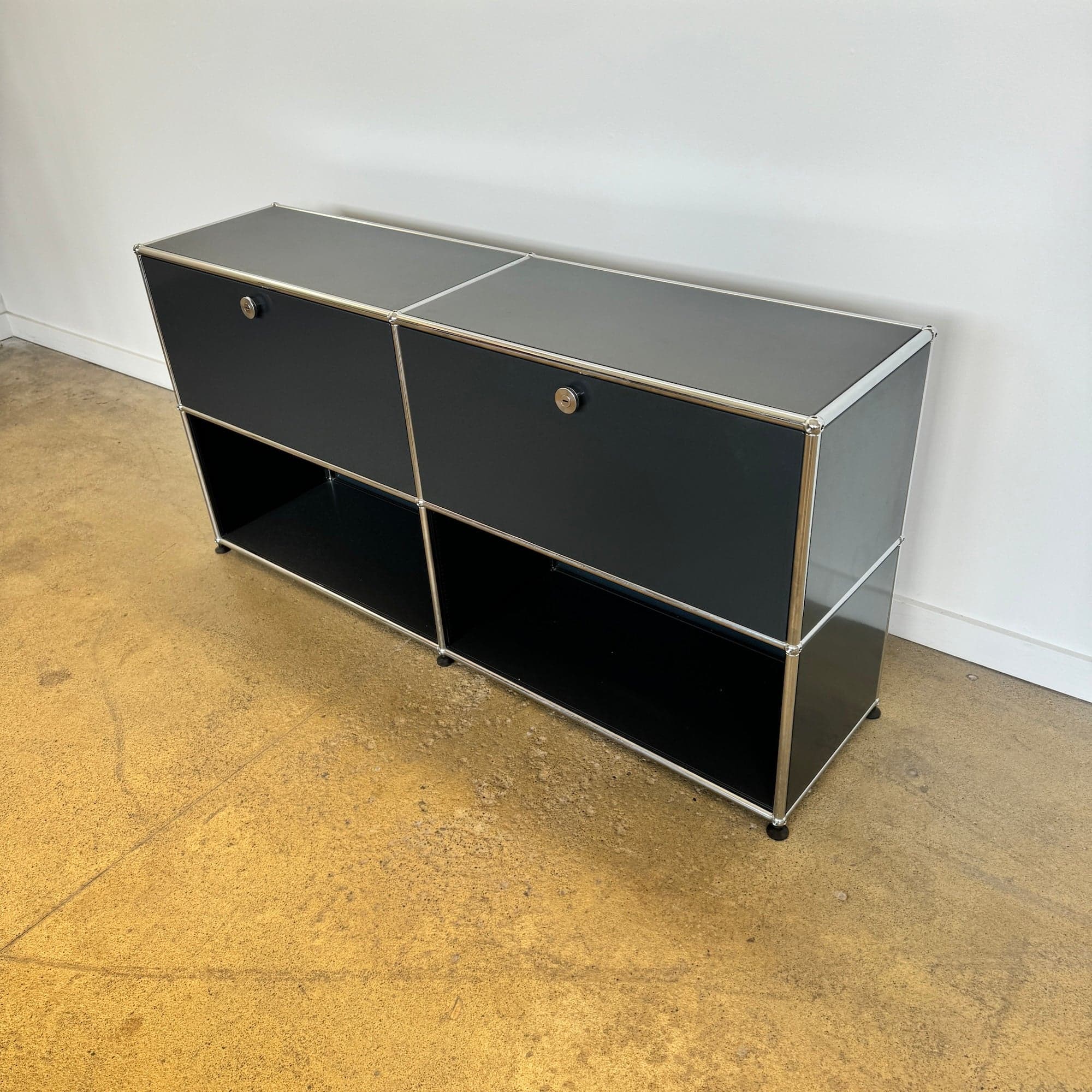 This is an authentic USM Haller with two drop downs and fully enclosed credenza storage system. Overall in good condition. Some light scuffs here and there from normal usage. No major scratches or damage. Dimensions: 29" H 60" W 15" D The USM Haller Collection, including the the USM Haller Open Storage Credenza, (1961), is crafted with precision. Designed by Fritz Haller and Paul Schaerer, the modular furniture collection is constructed of steel and built to last for generations. Pieces bought 50 years ago can be paired with those purchased today, and you can continue to add others as needs change. The Open Storage Credenza has two drop-down doors that lock with the twist of a coin. Made in Switzerland.