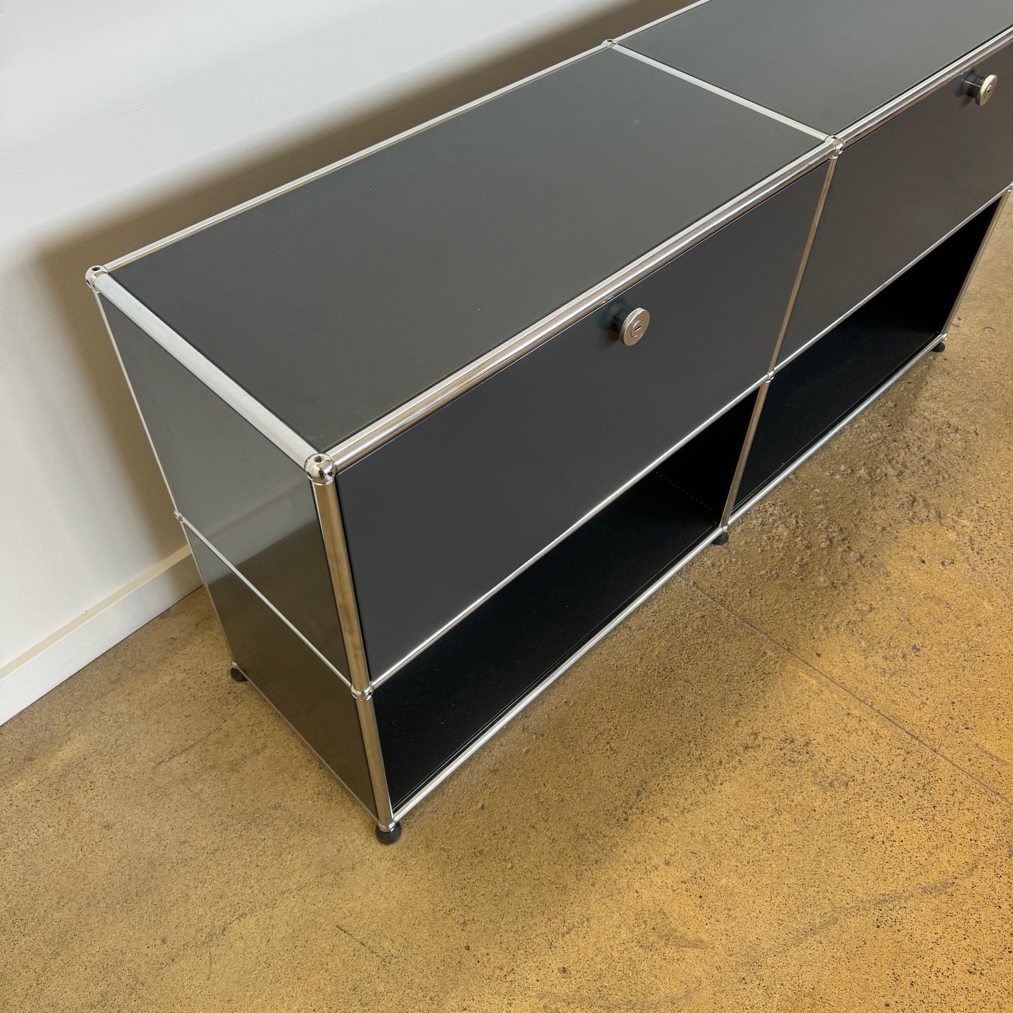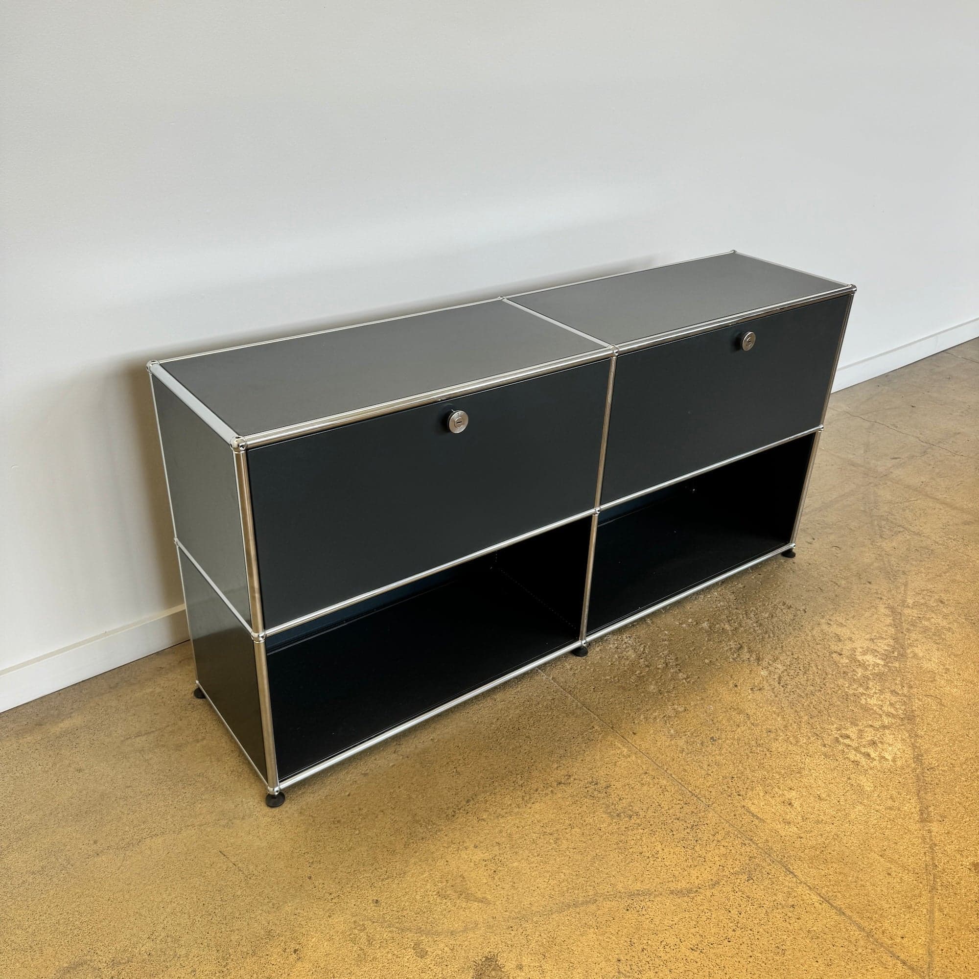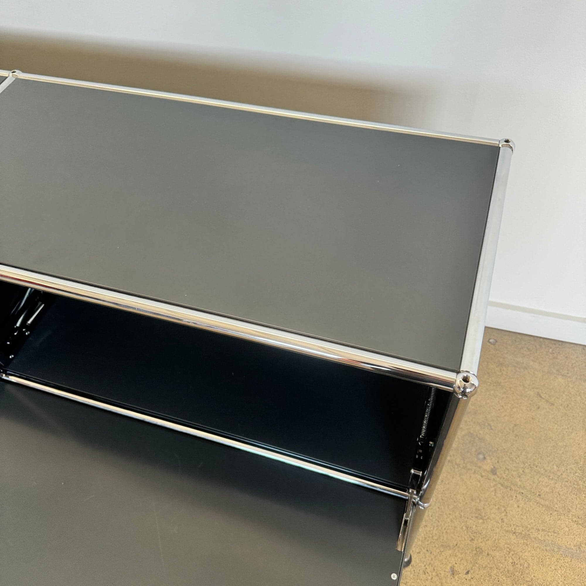 This is an authentic USM Haller with two drop downs and fully enclosed credenza storage system. Overall in good condition. Some light scuffs here and there from normal usage. No major scratches or damage. Dimensions: 29" H 60" W 15" D The USM Haller Collection, including the the USM Haller Open Storage Credenza, (1961), is crafted with precision. Designed by Fritz Haller and Paul Schaerer, the modular furniture collection is constructed of steel and built to last for generations. Pieces bought 50 years ago can be paired with those purchased today, and you can continue to add others as needs change. The Open Storage Credenza has two drop-down doors that lock with the twist of a coin. Made in Switzerland.