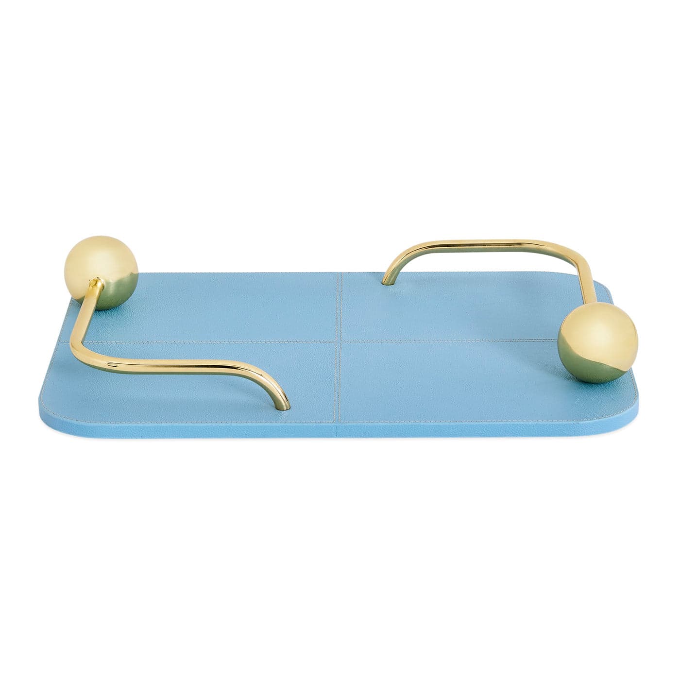 The St. Germain tray, wrapped in supple leather, features a soft light blue with timeless stitching. Two polished brass rails and ball handles give it a modernist flair, ideal for an ottoman or cocktail table, and just as stylish on a console.