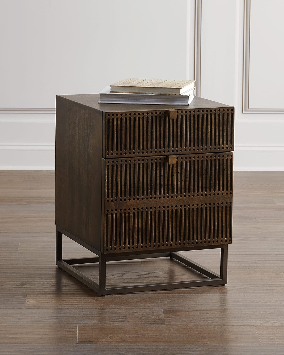 Unique linear carving meets new dimension with an artisan slant. Mango wood is finished in a vintage brown, highlighting texture and craftsmanship. A slim iron base adds an airy, cagelike look to the modern filing cabinet.