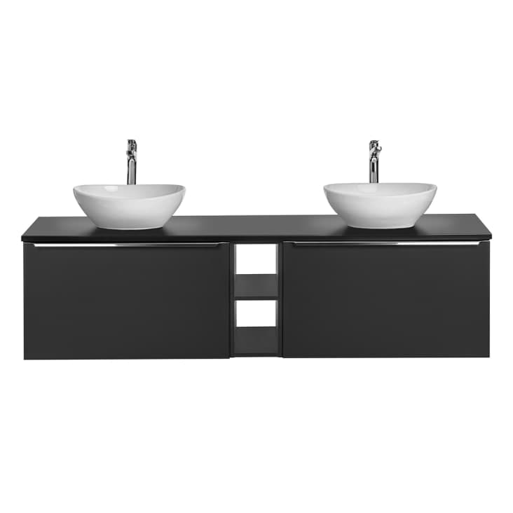 Mueble lavabo doble 180cm 2 nichos Eros Negro. Fabricación europea con tableros laminados y MDF de 16 mm y 25 mm. Incluye lavabos cerámicos, 2 cajones, 2 organizadores de cajones modulares, y un sistema de cierre silencioso.